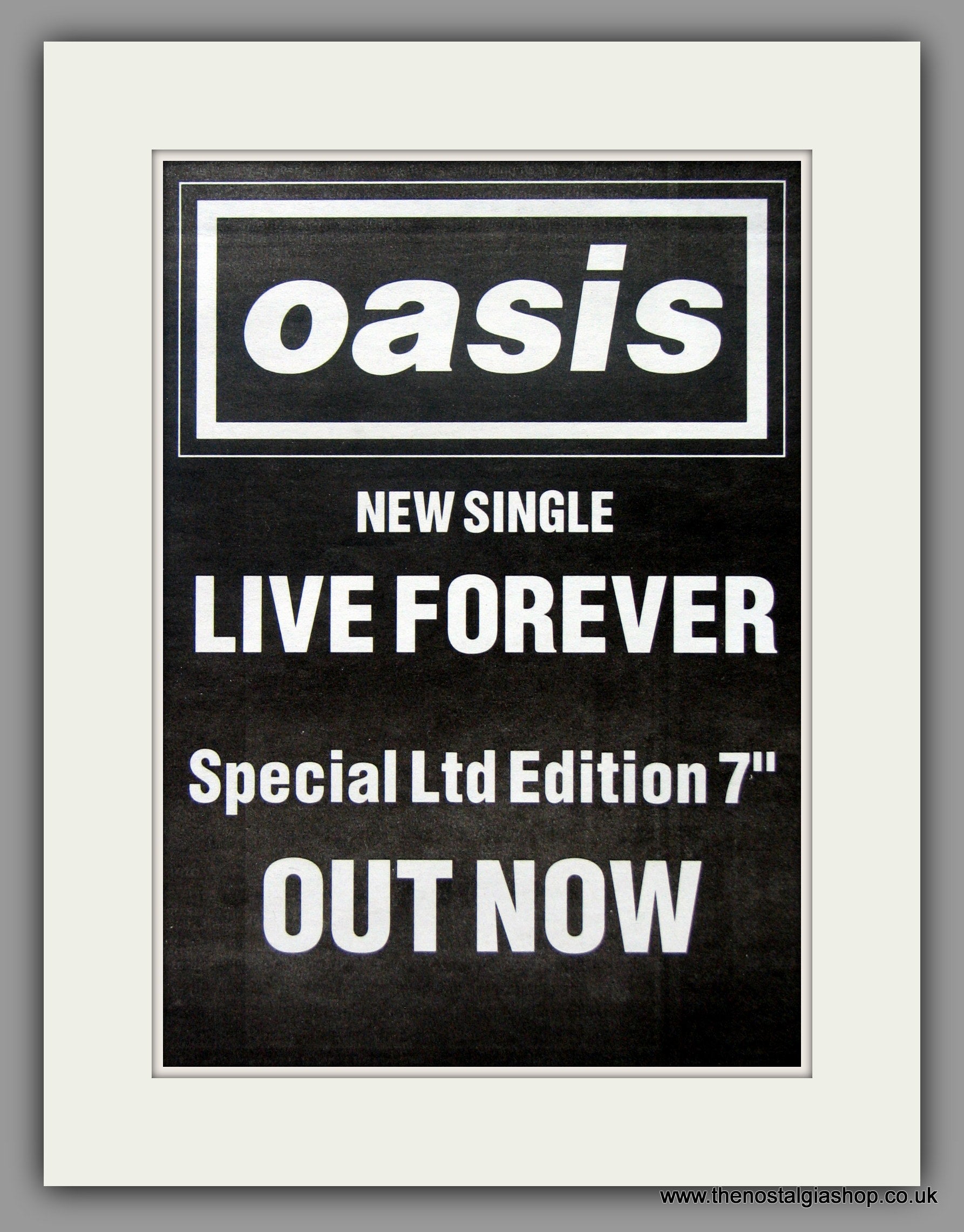 Oasis. Live Forever. Classic Original advert 1994. Presented in cream bevel cut mount with backing card and clear bag. Ready to fit in 12 x 10 inch frame. Want it framing? If so, buy this then go to Frames Available Category. Click to buy on the suitable frame and we will do the rest. All our adverts, unless clearly stated are Originals from the date shown. They make excellent pieces of wall art and stunning gifts. Many are rare and hard to find and once sold, may not be replaced. Remember you are buying a piece of history. Website watermark is not on original.