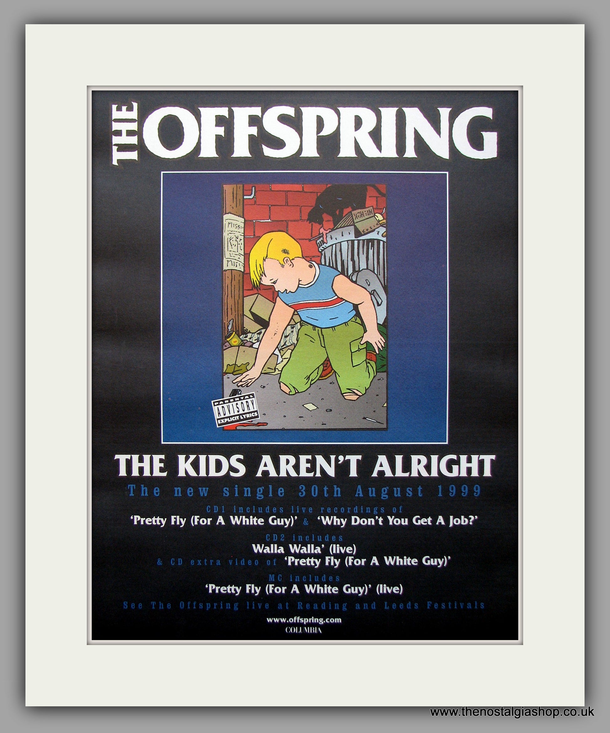 Offspring (The) - The Kids Aren't Alright. Original Vintage Advert 1999 (ref AD10938). Presented and supplied in a cream bevel cut mount with backing card and clear bag. Ready to fit in a 20x16 inch frame. The mounted advert will be posted via courier and well packed - protected with a sheet of hardboard to keep it rigid. Any questions or enquiries, please get in touch, we are here to help! All our adverts, unless clearly stated are originals from the date shown. They make excellent pieces of wall art and stunning gifts. Many are rare and hard to find and once sold, may not be replaced. Remember you are buying a piece of history. Website watermark is not on original.