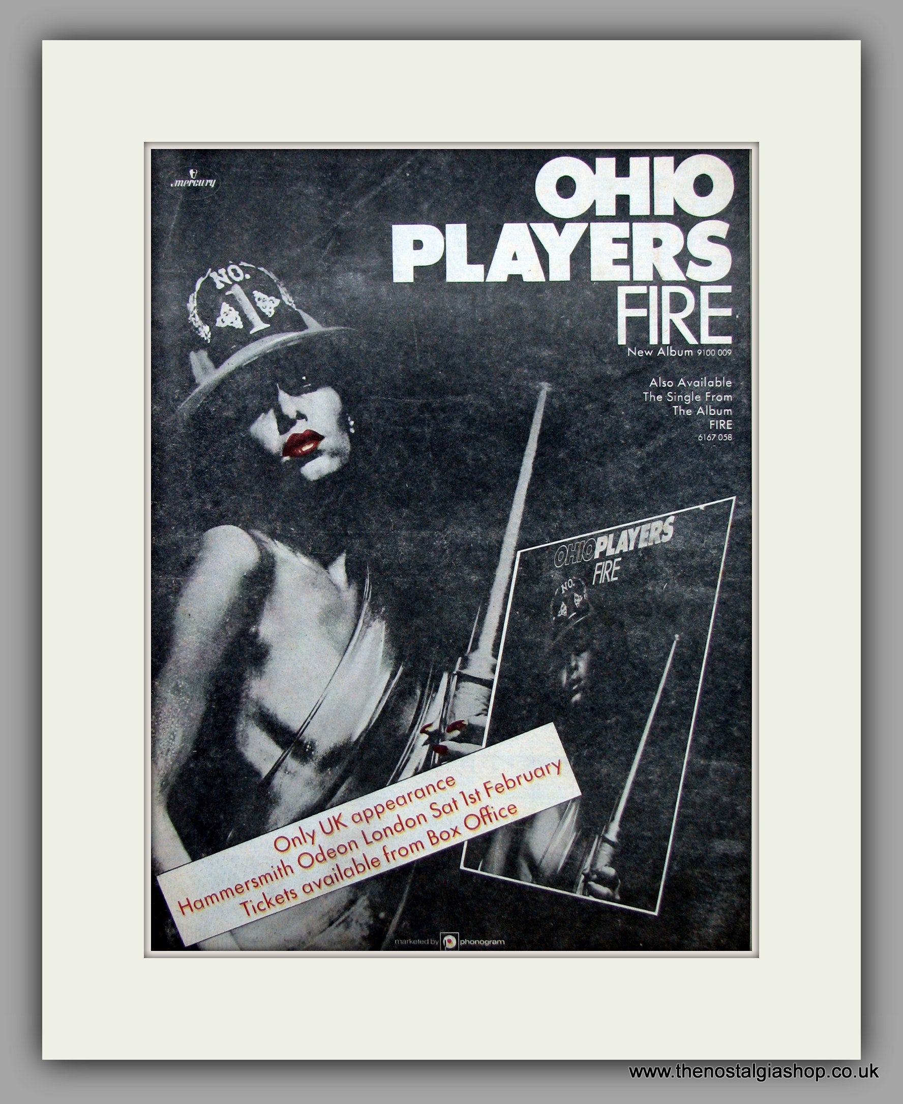 Ohio Players-Fire. Original Vintage Advert 1975 (ref AD10506). Presented and supplied in a cream bevel cut mount with backing card and clear bag. Ready to fit in a 20x16 inch frame. The mounted advert will be posted via courier and well packed - protected with a sheet of hardboard to keep it rigid. Any questions or enquiries, please get in touch, we are here to help! All our adverts, unless clearly stated are originals from the date shown. They make excellent pieces of wall art and stunning gifts. Many are rare and hard to find and once sold, may not be replaced. Remember you are buying a piece of history. Website watermark is not on original.