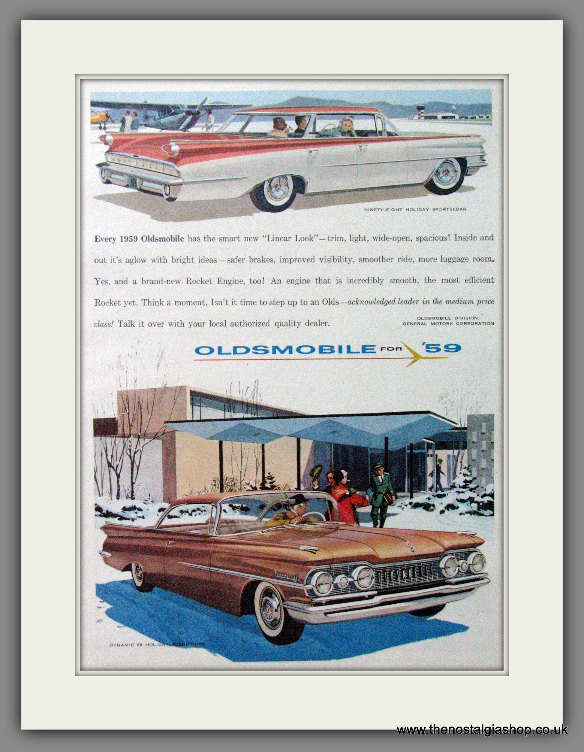 Oldsmobile 88 and 98 Holiday. '59. Vintage Advert. Classic Original American advert 1959. Presented and Supplied in cream bevel cut mount, size 14 x 11 inches with backing card and clear bag. Ready to frame. Want it framing? If so, buy this then go to Frames Available Category. Click to buy on the suitable frame and we will do the rest. All our adverts, unless clearly stated are Originals from the date shown They make excellent pieces of wall art and stunning gifts. Many are rare and hard to find and once sold, may not be replaced. Remember you are buying a piece of history. Website watermark is not on original.