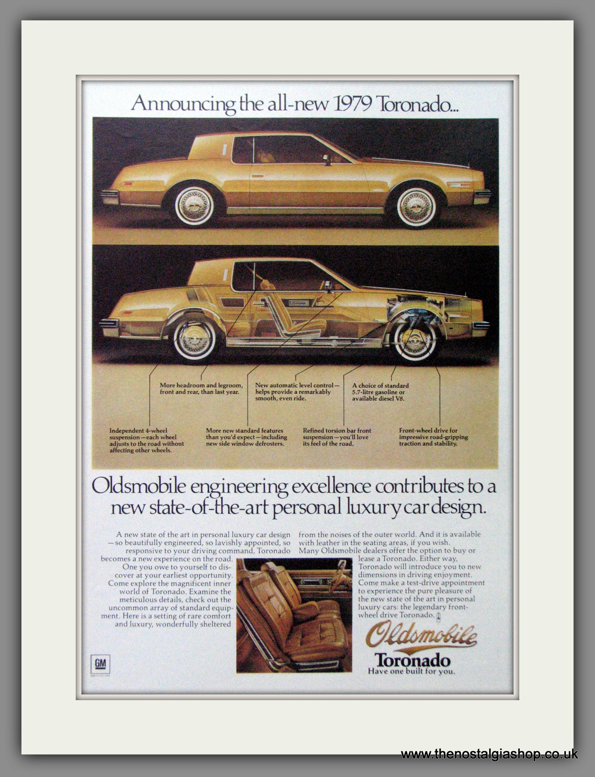 Oldsmobile Toronado '79. Vintage Advert. Classic Original American advert 1979. Presented and Supplied in cream bevel cut mount, size 14 x 11 inches with backing card and clear bag. Ready to frame. Want it framing? If so, buy this then go to Frames Available Category. Click to buy on the suitable frame and we will do the rest. All our adverts, unless clearly stated are Originals from the date shown They make excellent pieces of wall art and stunning gifts. Many are rare and hard to find and once sold, may not be replaced. Remember you are buying a piece of history. Website watermark is not on original.