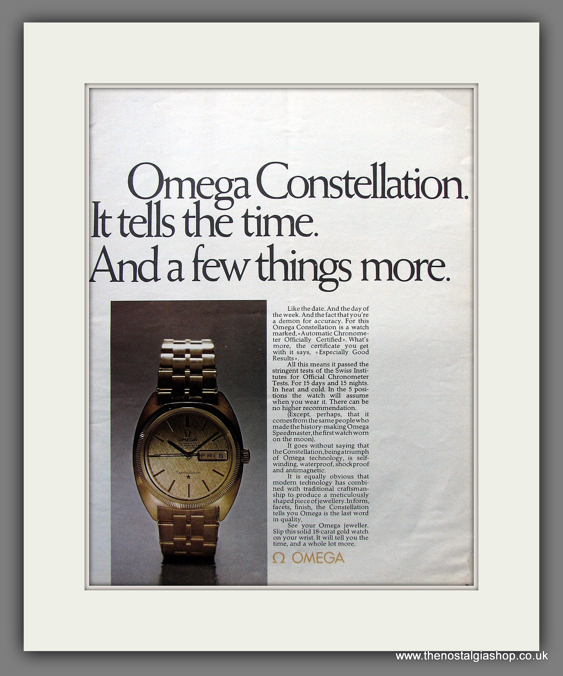 Omega Constellation Chronometer. Vintage Advert. This is a large classic Original advert 1970. Presented in cream bevel cut mount with backing card and clear bag. Ready to fit in 18 x 14 inch frame. The mounted advert will be posted via courier and well packed - protected with a sheet of hardboard to keep it rigid. Any questions or inquiries, please get in touch, we are here to help! All our adverts, unless clearly stated are Originals from the date shown. They make excellent pieces of wall art and stunning gifts. Many are rare and hard to find and once sold, may not be replaced. Remember you are buying a piece of history. Website watermark is not on original. Faint Crease down centre of advert.