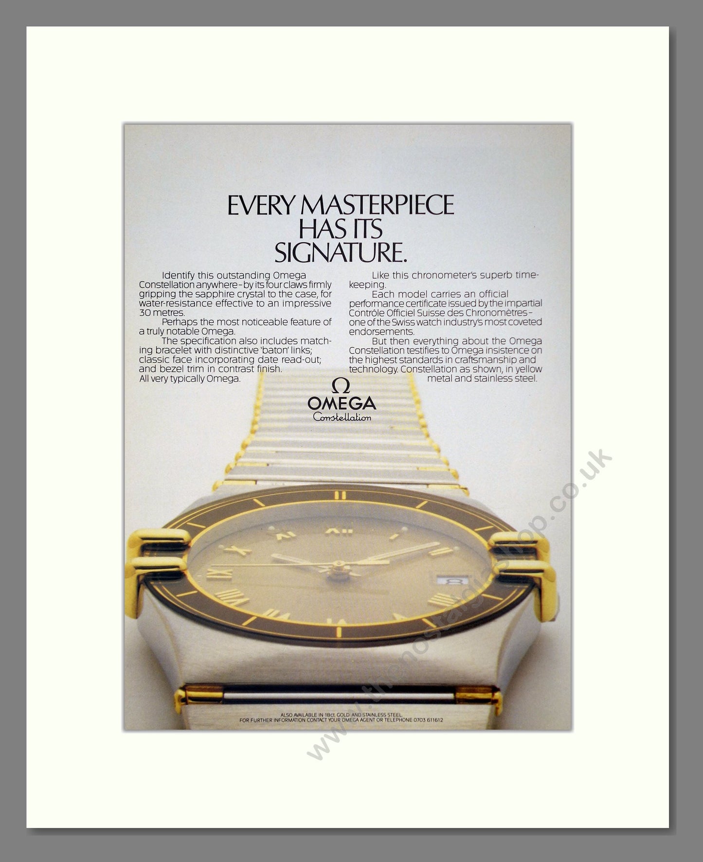 Omega - Constellation. Vintage Advert. This is a classic original advert from 1984. Presented and supplied in a cream bevel cut mount with backing card and clear bag. Ready to fit in a 14 x 11 inches frame. The mounted advert will be posted via courier and well packed - protected with a sheet of hardboard to keep it rigid. Any questions or enquiries, please get in touch, we are here to help! All our adverts, unless clearly stated are originals from the date shown. They make excellent pieces of wall art and stunning gifts. Many are rare and hard to find and once sold, may not be replaced. Remember you are buying a piece of history. Website watermark is not on original.