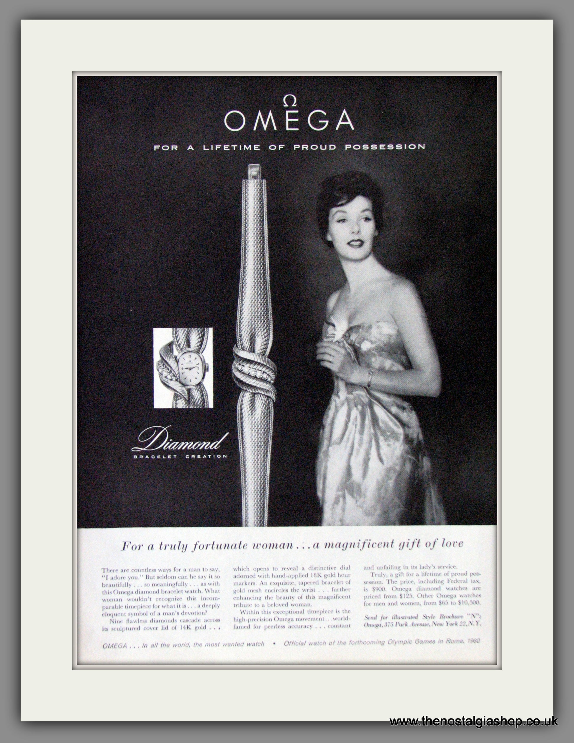 Omega Diamond Bracelet Watch. Classic Original American Advert 1959. Presented and supplied in a cream bevel cut mount with backing card and clear bag. Ready to fit in 14 x 11 inch frame. Want it framing? If so, buy this then go to Frames Available Category. Click to buy on the suitable frame and we will do the rest. All our adverts, unless clearly stated are Originals from the date shown. They make excellent pieces of wall art and stunning gifts. Many are rare and hard to find and once sold, may not be replaced. Remember you are buying a piece of history. Website watermark is not on original.
