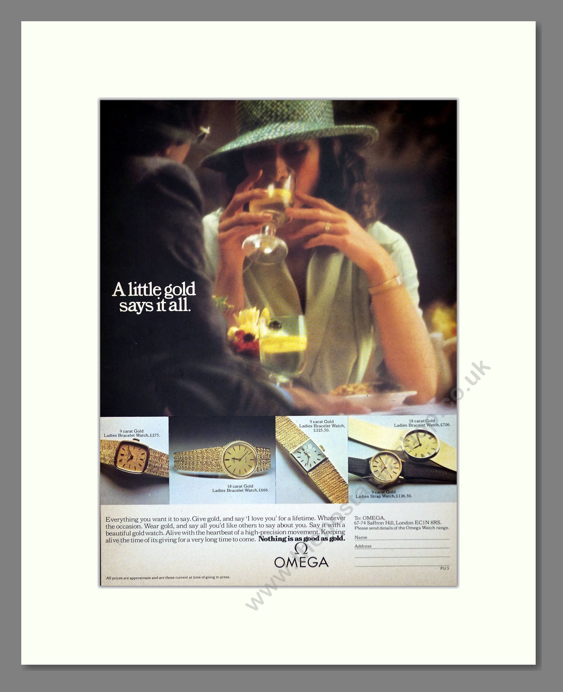 Omega - Gold Watches. Vintage Advert. This is a classic original advert from 1975. Presented and supplied in a cream bevel cut mount with backing card and clear bag. Ready to fit in a 14 x 11 inches frame. The mounted advert will be posted via courier and well packed - protected with a sheet of hardboard to keep it rigid. Any questions or enquiries, please get in touch, we are here to help! All our adverts, unless clearly stated are originals from the date shown. They make excellent pieces of wall art and stunning gifts. Many are rare and hard to find and once sold, may not be replaced. Remember you are buying a piece of history. Website watermark is not on original.