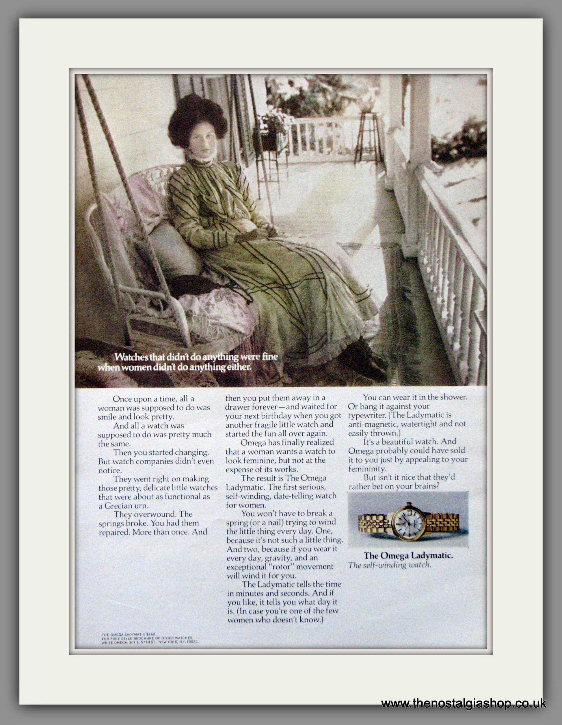 Omega Ladymatic Watch. Classic Original Advert 1969. Presented and supplied in a cream bevel cut mount with backing card and clear bag. Ready to fit in 14 x 11 inch frame. Want it framing? If so, buy this then go to Frames Available Category. Click to buy on the suitable frame and we will do the rest. All our adverts, unless clearly stated are Originals from the date shown. They make excellent pieces of wall art and stunning gifts. Many are rare and hard to find and once sold, may not be replaced. Remember you are buying a piece of history. Website watermark is not on original.
