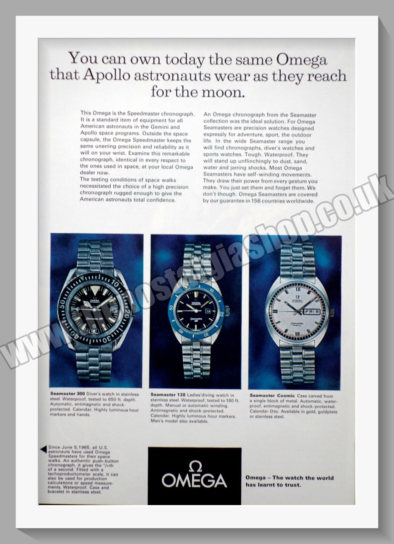 Omega Seamaster and Speedmaster Watches. Classic Original Vintage Advert 1969. Double Advert Presented and supplied in 2 cream bevel cut mounts with backing card and clear bag. Each is ready to fit in 14 x 11 inch frame. All our adverts, unless clearly stated are Originals from the date shown. They make excellent pieces of wall art and stunning gifts. Many are rare and hard to find and once sold, may not be replaced. Remember you are buying a piece of history. Website watermark is not on original.