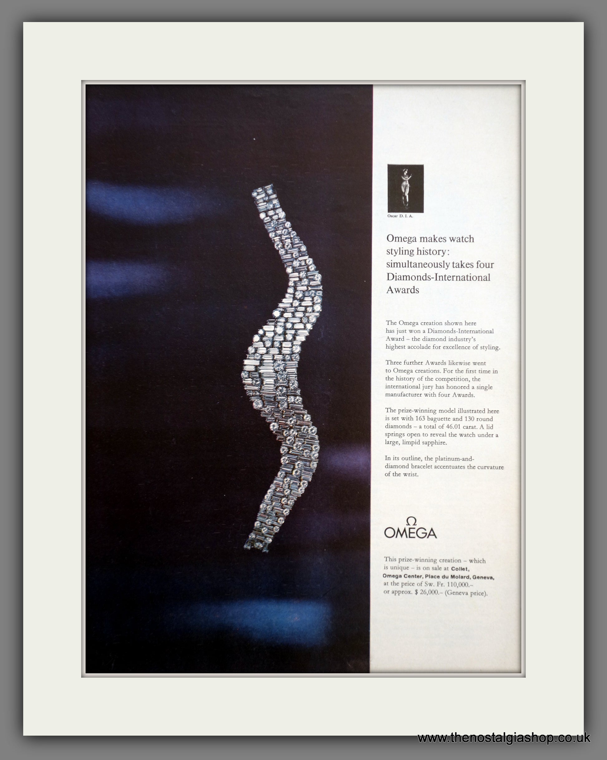 Omega Watches. Original Vintage Double Advert 1969. Presented and supplied in 2 cream bevel cut mounts with backing card and clear bags. Ready to fit in two 18 x 14 inch frames. All our adverts, unless clearly stated are Originals from the date shown. They make excellent pieces of wall art and stunning gifts. Many are rare and hard to find and once sold, may not be replaced. Remember you are buying a piece of history. Website watermark is not on original.