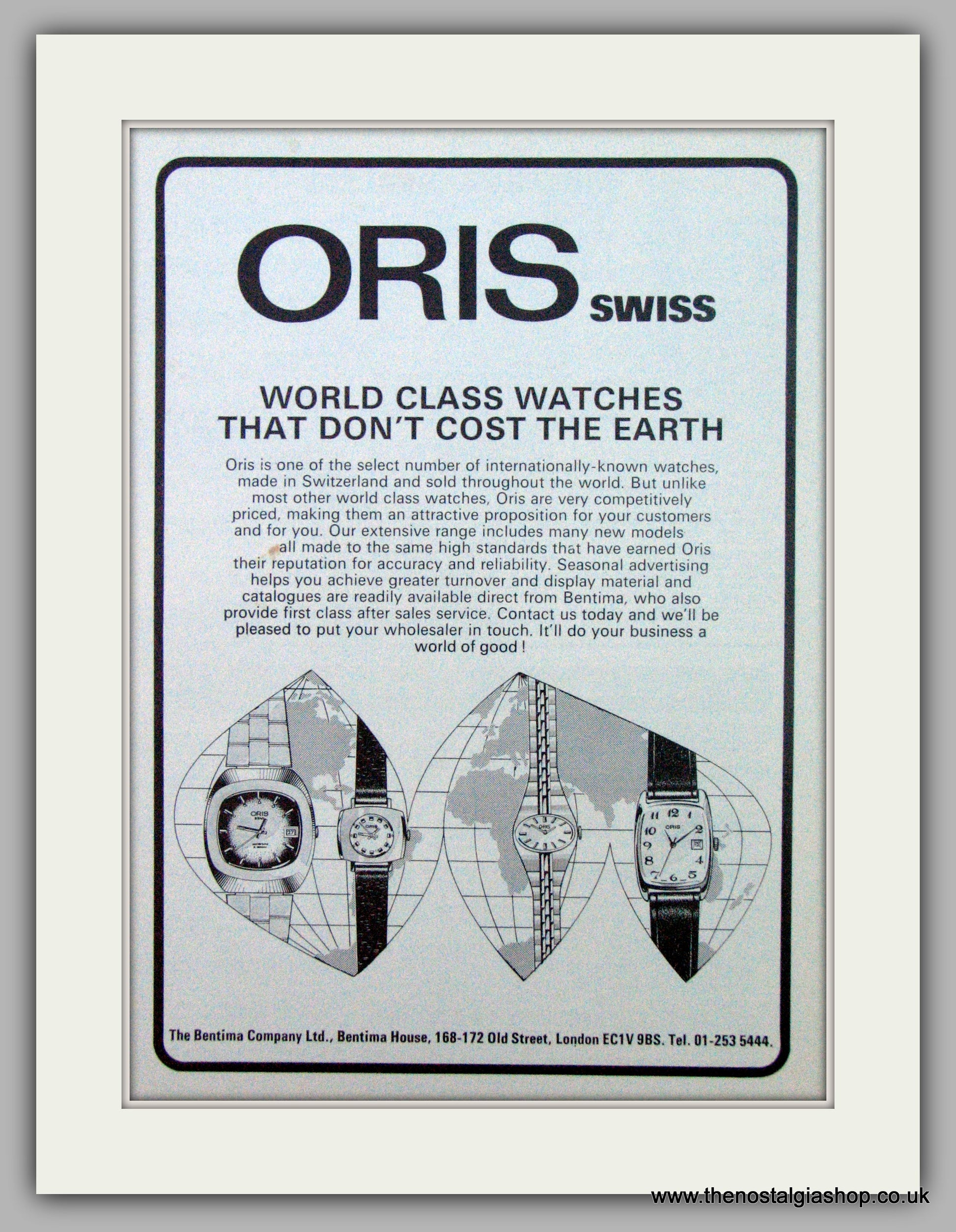 Oris Watches. The Bentima Company Ltd . Vintage Advert. Original Advert 1976. Presented in cream bevel cut mount with backing card and clear bag. Ready to fit in 14 x 11 inch frame. Want it framing? If so, buy this then go to Frames Available Category. Click to buy on the suitable frame(s) and we will do the rest. All our adverts, unless clearly stated are Originals from the date shown. They make excellent pieces of wall art and stunning gifts. Many are rare and hard to find and once sold, may not be replaced. Remember you are buying a piece of history. Website watermark is not on original.