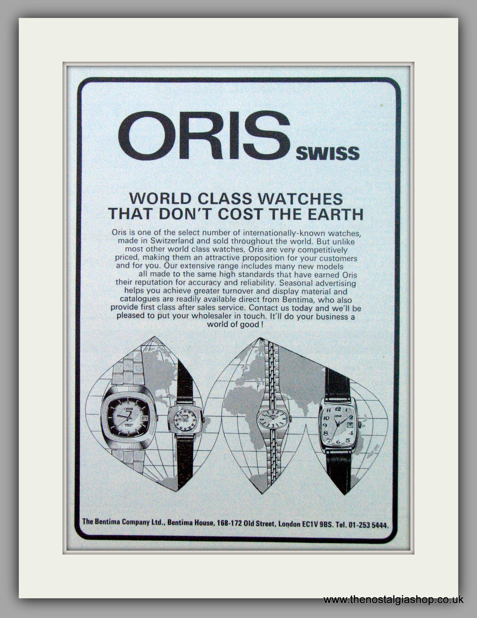 Oris Watches. The Bentima Co Ltd. Vintage Adverts. Set of 2 Original Adverts 1976. Presented in cream bevel cut mounts with backing card and clear bags. Ready to fit in 14 x 11 inch frames. Want them framing? If so, buy this then go to Frames Available Category. Click to buy on the suitable frame(s) and we will do the rest. All our adverts, unless clearly stated are Originals from the date shown. They make excellent pieces of wall art and stunning gifts. Many are rare and hard to find and once sold, may not be replaced. Remember you are buying a piece of history. Website watermark is not on original.