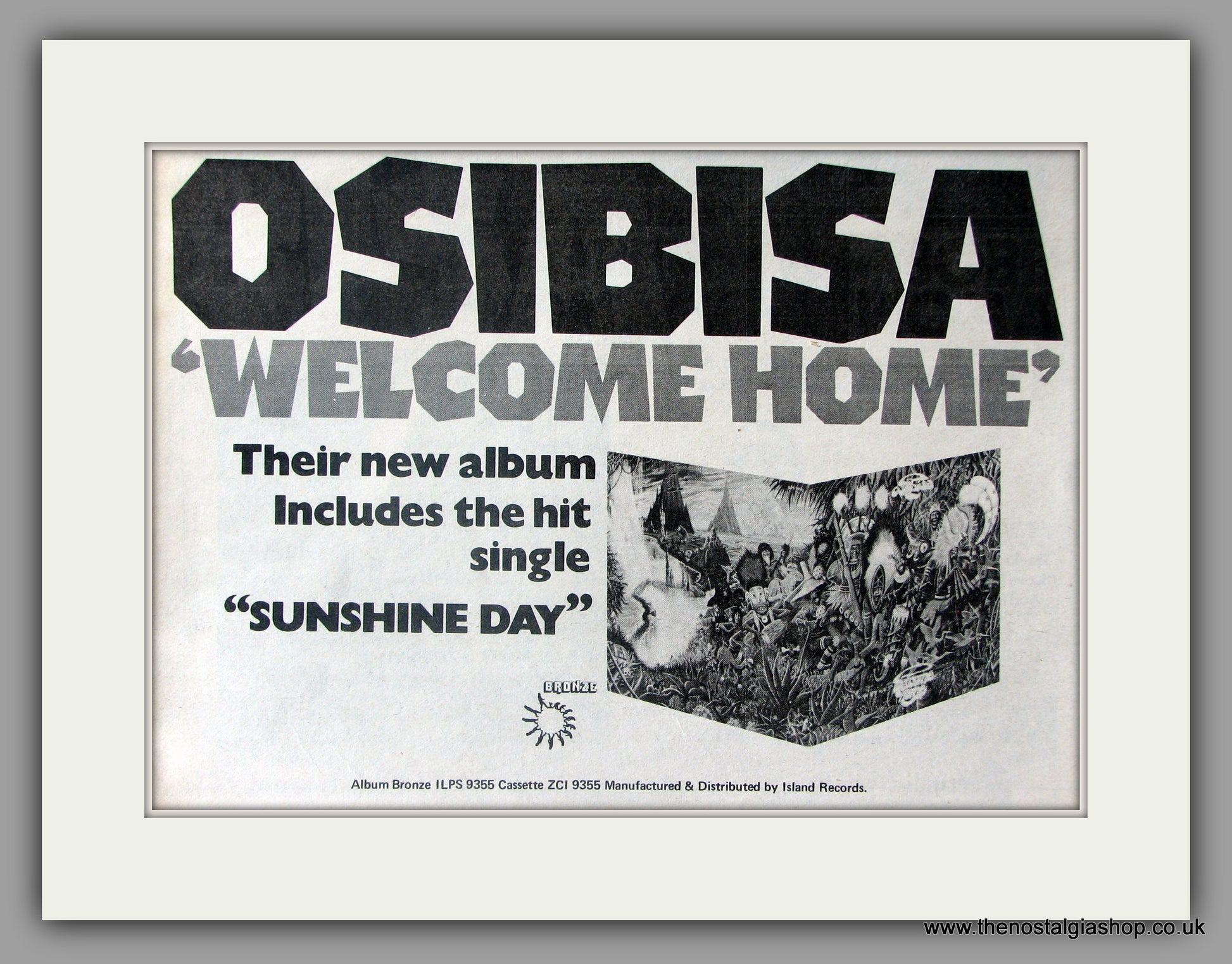 Osibisa. Welcome Home. Vintage Advert. Classic original advert 1974. Presented in cream bevel cut mount with backing card and display bag. Ready to fit in 14 x 11 inch frame. Want it framing? If so, buy this then go to Frames Available Category. Click to buy on the suitable frame and we will do the rest. All our adverts, unless clearly stated are Originals from the date shown. They make excellent pieces of wall art and stunning gifts. Many are rare and hard to find and once sold, may not be replaced. Remember you are buying a piece of history. Website watermark is not on original.