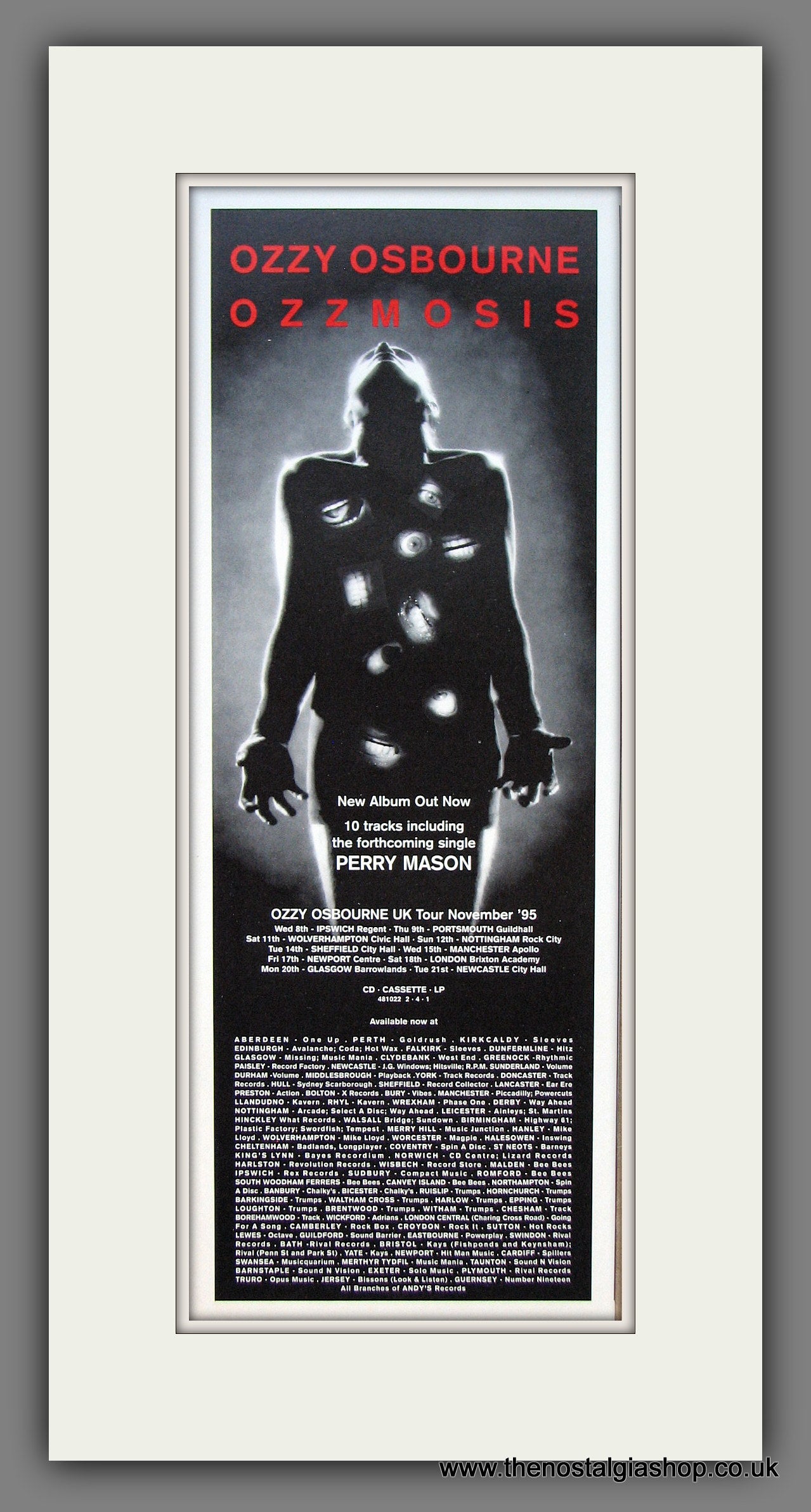 Ozzy Osbourne. Ozzmosis. This is a classic Original Vintage Advert 1995. Presented and Supplied in a cream bevel cut mount with backing card and clear bag. Ready to fit in 14.5 x 7 inch frame. The mounted advert will be posted via courier and well packed - protected with a sheet of hardboard to keep it rigid. Any questions or inquiries, please get in touch, we are here to help! All our adverts, unless clearly stated are Originals from the date shown. They make excellent pieces of wall art and stunning gifts. Many are rare and hard to find and once sold, may not be replaced. Remember you are buying a piece of history. Website watermark is not on original.