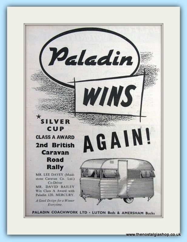 Paladin Caravans. Paladin wins again! Classic original advert 1955. Presented in cream bevel cut mount with backing card and clear bag. Ready to fit in 14 x 11 inch frame. Want it framing? If so, buy this then go to Frames Available Category. Click to buy on the suitable frame and we will do the rest. All our adverts, unless clearly stated are Originals from the date shown They make excellent pieces of wall art and stunning gifts. Many are rare and hard to find and once sold, may not be replaced. Remember you are buying a piece of history. Website watermark is not on original.