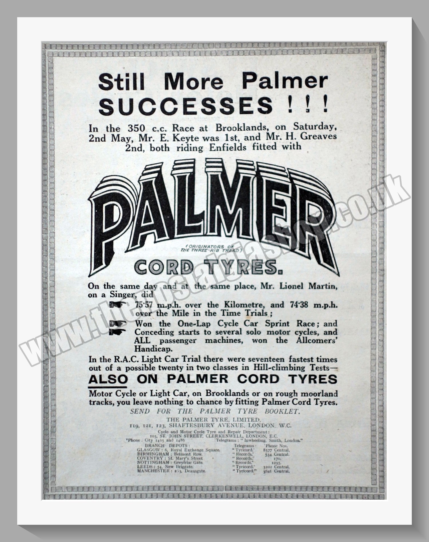 Palmer Cord Motor Cycle Tyre. Original Vintage Advert 1914. Presented and Supplied in a 14 x 11 Inch, cream bevel cut mount with backing card and clear bag. Ready to frame. All our adverts, unless clearly stated are Originals from the date shown They make excellent pieces of wall art and stunning gifts. Many are rare and hard to find and once sold, may not be replaced. Remember you are buying a piece of history. Website watermark is not on original. Vintage Motorcycle Tyres, Old Motorcycle Tyres.