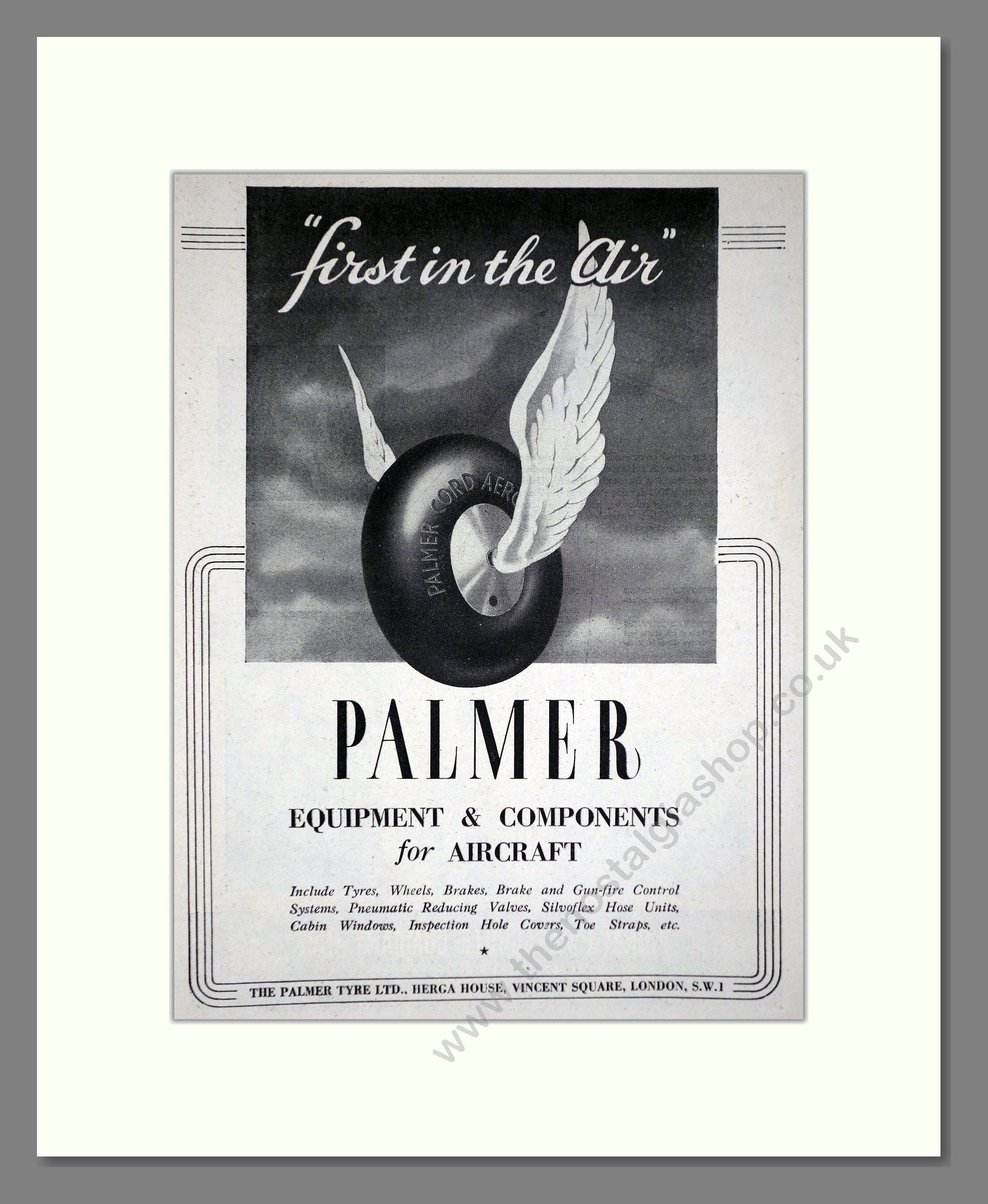 Palmer Equipment And Components - First In The Air. Vintage Advert. This is a classic original advert from 1944. Presented and supplied in a cream bevel cut mount with backing card and clear bag. Ready to fit in a 14 x 11 inches frame. The mounted advert will be posted via courier and well packed - protected with a sheet of hardboard to keep it rigid. Any questions or enquiries, please get in touch, we are here to help! All our adverts, unless clearly stated are originals from the date shown. They make excellent pieces of wall art and stunning gifts. Many are rare and hard to find and once sold, may not be replaced. Remember you are buying a piece of history. Website watermark is not on original.