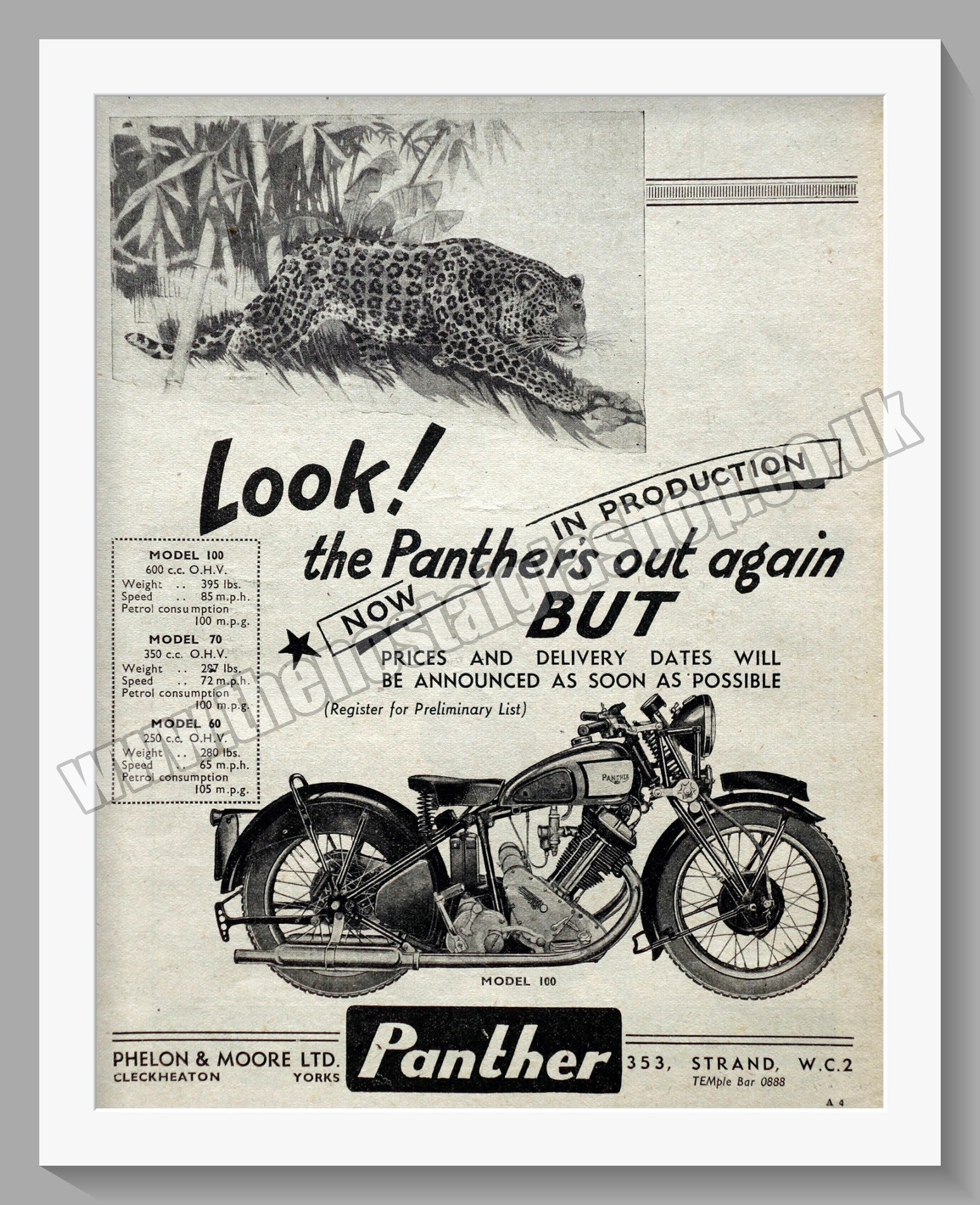 Panther Motor Cycles. Panther Model 100. Original advert from 1945. Presented and Supplied in a cream bevel cut mount with backing board and Clear Bag. Made to fit straight into 14x11 inch frame. The perfect gift.- These adverts are all Originals from the dates stated. They are NOT modern reprints. Many are difficult to get hold of , some are very rare and once sold may not be replaced, Remember, you are buying a piece of historic nostalgia. Lots more adverts available. Please contact us if you don't see the advert you want. Phelon & Moore Ltd, Cleckheaton.