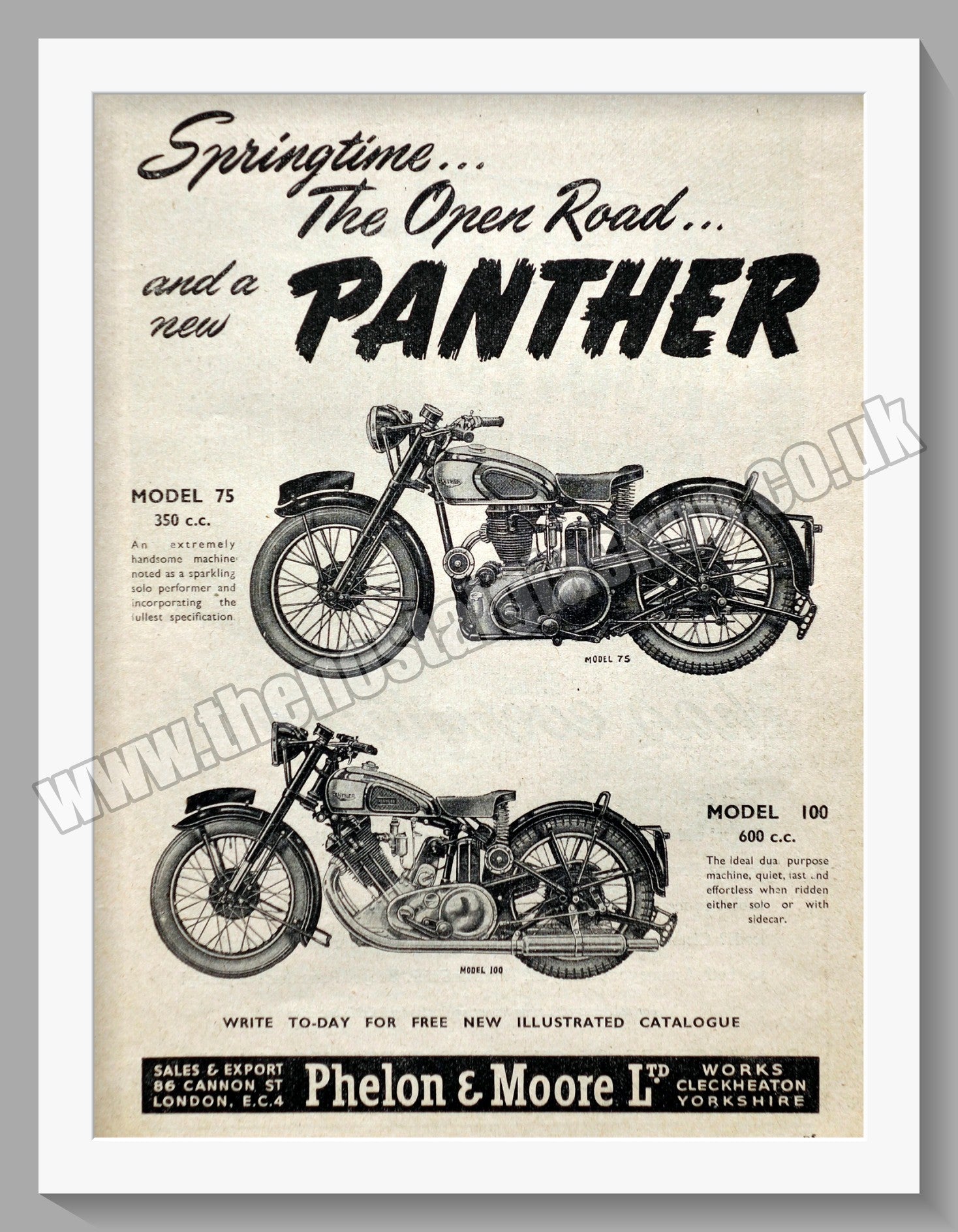 Panther Motor Cycles. Model 75 and 100. Original advert from 1950. Presented and Supplied in a cream bevel cut mount with backing board and Clear Bag. Made to fit straight into 14x11 inch frame. The perfect gift.- These adverts are all Originals from the dates stated. They are NOT modern reprints. Many are difficult to get hold of , some are very rare and once sold may not be replaced, Remember, you are buying a piece of historic nostalgia. Lots more adverts available. Please contact us if you don't see the advert you want. Phelon & Moore Ltd, Cleckheaton.