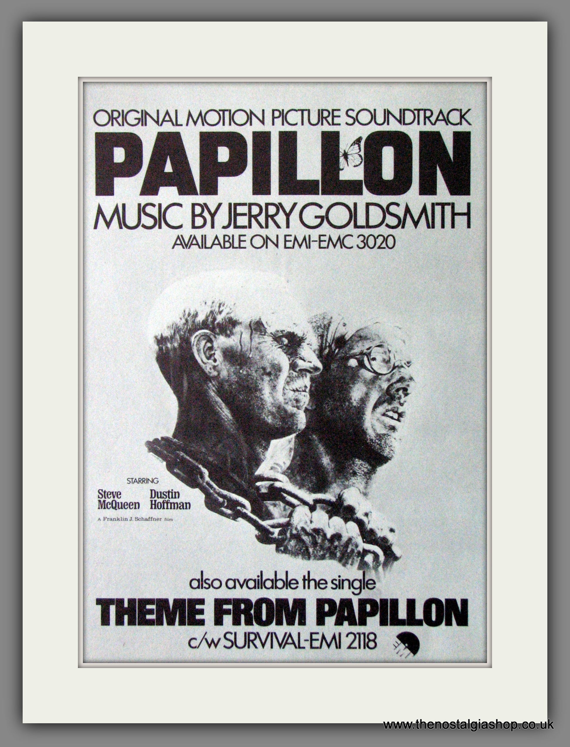 Papillon, Steve McQueen, Dustin Hoffman. Classic original advert 1974. Presented and Supplied in cream bevel cut mount with backing card and clear bag. Ready to fit in 14 x 11 inch frame. Want it framing? If so, buy this then go to Frames Available Category. Click to buy on the suitable frame and we will do the rest. All our adverts, unless clearly stated are Originals from the date shown. They make excellent pieces of wall art and stunning gifts. Many are rare and hard to find and once sold, may not be replaced. Remember you are buying a piece of history. Website watermark is not on original.