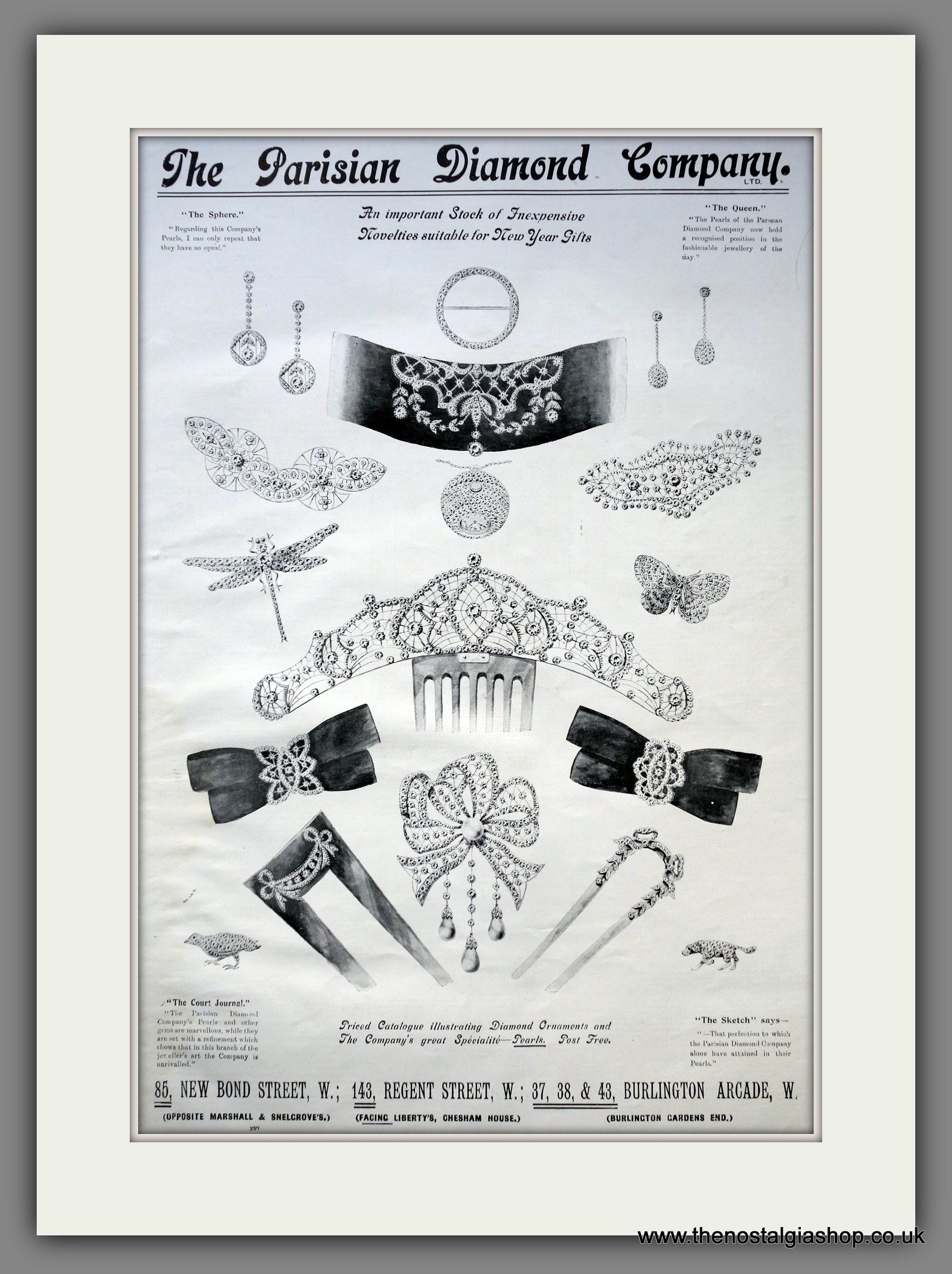 Parisian Diamond Company London. Jewellery. Vintage Advert. This is a large classic Original advert 1912. Presented in cream bevel cut mount with backing card and clear bag. Ready to fit in 20 x 16 inch frame. The mounted advert will be posted via courier and well packed - protected with a sheet of hardboard to keep it rigid. Any questions or inquiries, please get in touch, we are here to help! All our adverts, unless clearly stated are Originals from the date shown. They make excellent pieces of wall art and stunning gifts. Many are rare and hard to find and once sold, may not be replaced. Remember you are buying a piece of history. Website watermark is not on original .