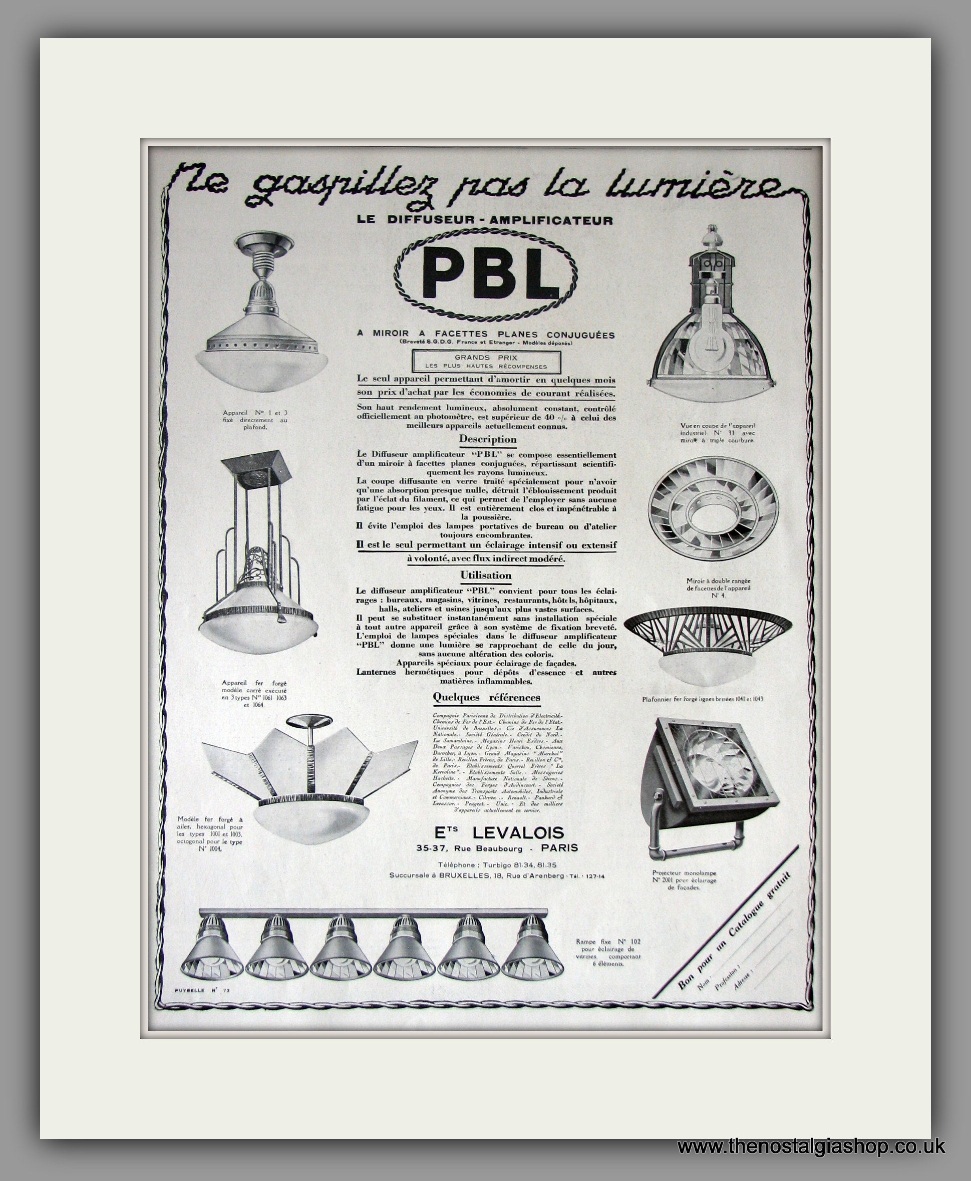 PBL Lamps and Lighting. Original French Advert 1929 (ref AD11443). Presented and supplied in a cream bevel cut mount with backing card and clear bag. Ready to fit in a 20x16 inch frame. The mounted advert will be posted via courier and well packed - protected with a sheet of hardboard to keep it rigid. Any questions or enquiries, please get in touch, we are here to help! All our adverts, unless clearly stated are originals from the date shown. They make excellent pieces of wall art and stunning gifts. Many are rare and hard to find and once sold, may not be replaced. Remember you are buying a piece of history. Website watermark is not on original.