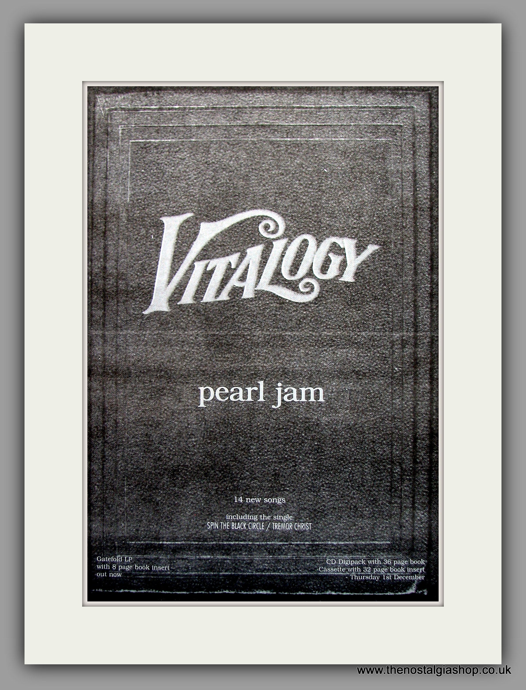Pearl Jam - Vitalogy. Original Vintage Advert 1994 (ref AD10961). Presented and supplied in a cream bevel cut mount with backing card and clear bag. Ready to fit in a 20x16 inch frame. The mounted advert will be posted via courier and well packed - protected with a sheet of hardboard to keep it rigid. Any questions or enquiries, please get in touch, we are here to help! All our adverts, unless clearly stated are originals from the date shown. They make excellent pieces of wall art and stunning gifts. Many are rare and hard to find and once sold, may not be replaced. Remember you are buying a piece of history. Website watermark is not on original.