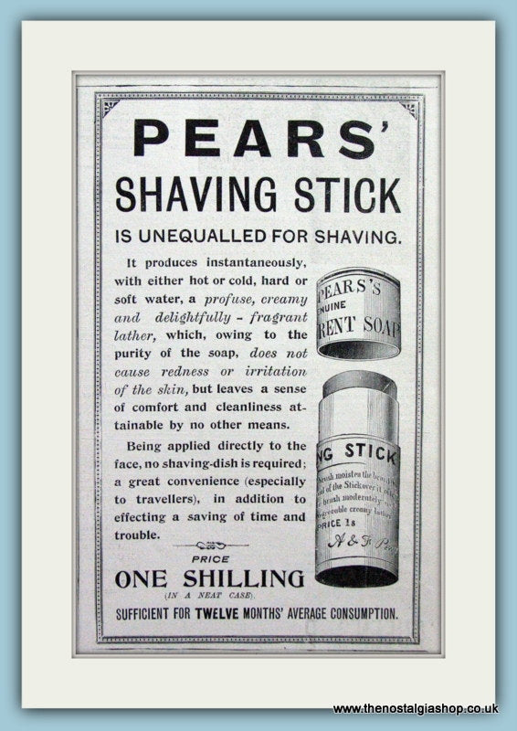 Pears Shaving Stick. Is unequalled for shaving. Original Vintage Advert 1899. Presented and Supplied in a cream bevel cut mount with backing card and clear bag. Ready to fit in 10 x 8 inch frame. All our adverts, unless clearly stated are Originals from the date shown They make excellent pieces of wall art and stunning gifts. Many are rare and hard to find and once sold, may not be replaced. Remember you are buying a piece of history. Website watermark is not on original. Barbering and Shaving Adverts, Barber Shop Adverts.
