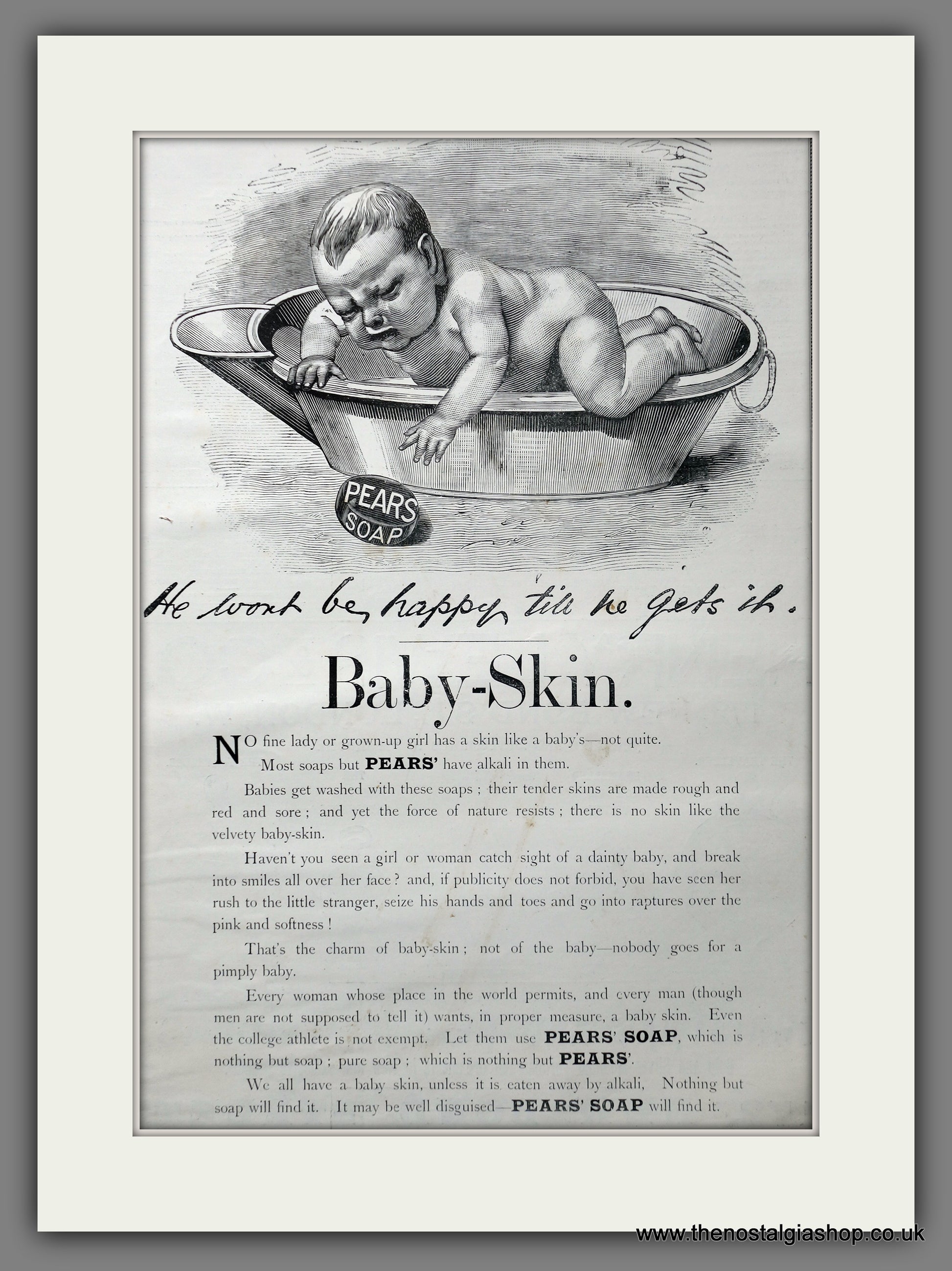 Pears' Soap. Classic Original Advert 1891. Presented and Supplied in a Cream Mount, backing board and clear bag, size 18 x 14 Inches. Item will be well packed with a sheet of hardboard to prevent damage. All our adverts, unless clearly stated are Originals from the date shown They make excellent pieces of wall art and stunning gifts. Many are rare and hard to find and once sold, may not be replaced. Remember you are buying a piece of history. Website watermark is not on original.
