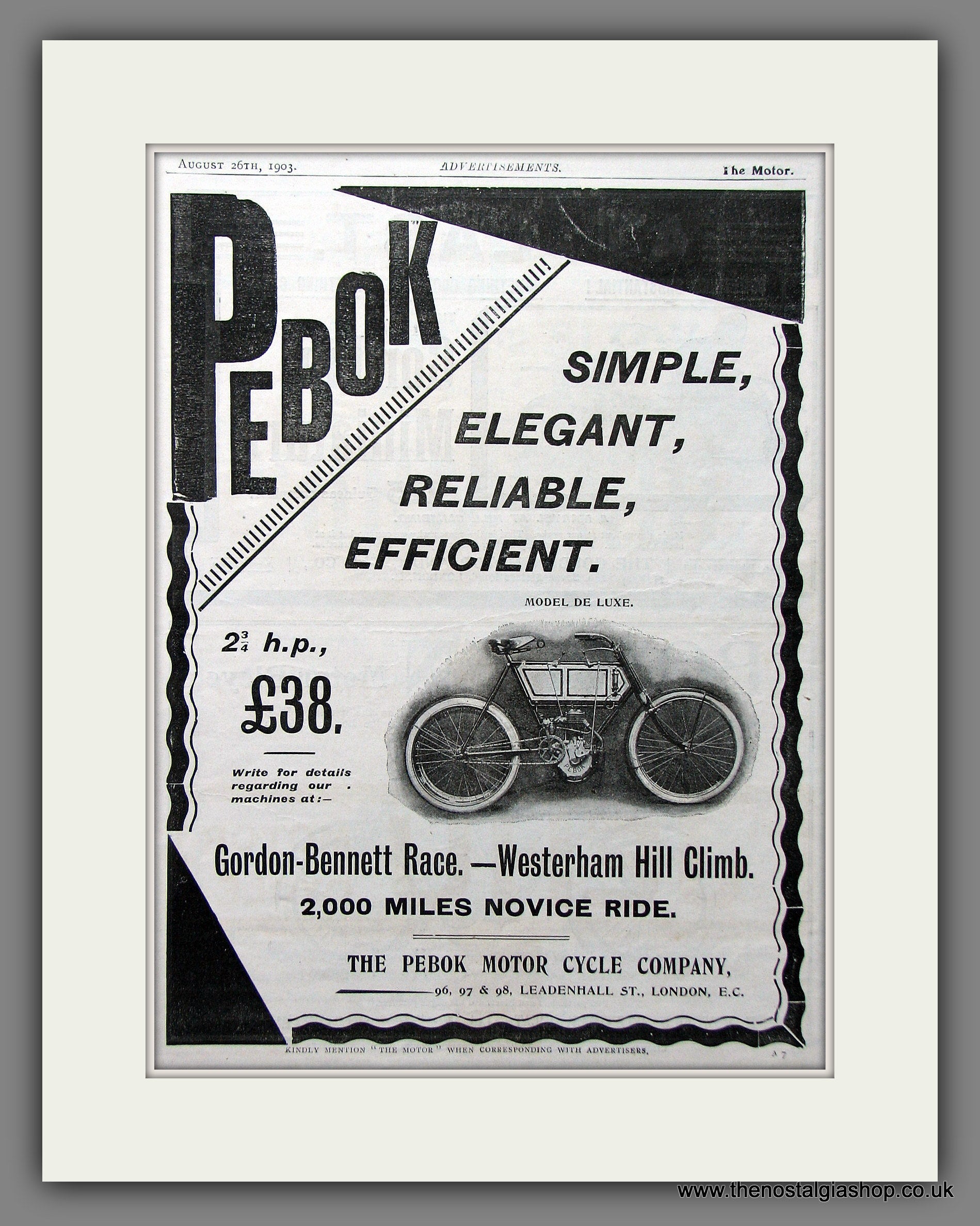 Pebok Motorcycles. Gordon Bennett Race, Westerham Hill Climb. Ultra Rare Classic Original Vintage advert 1903. Presented and Supplied in a cream bevel cut mount with backing card and clear bag. Ready to fit in 14 x 11 inch frame. Want it framing? If so, buy this then go to Frames Available Category. Click to buy on the suitable frame and we will do the rest. All our adverts, unless clearly stated are Originals from the date shown. They make excellent pieces of wall art and stunning gifts. Many are rare and hard to find and once sold, may not be replaced. Remember you are buying a piece of history. Website watermark is not on original.