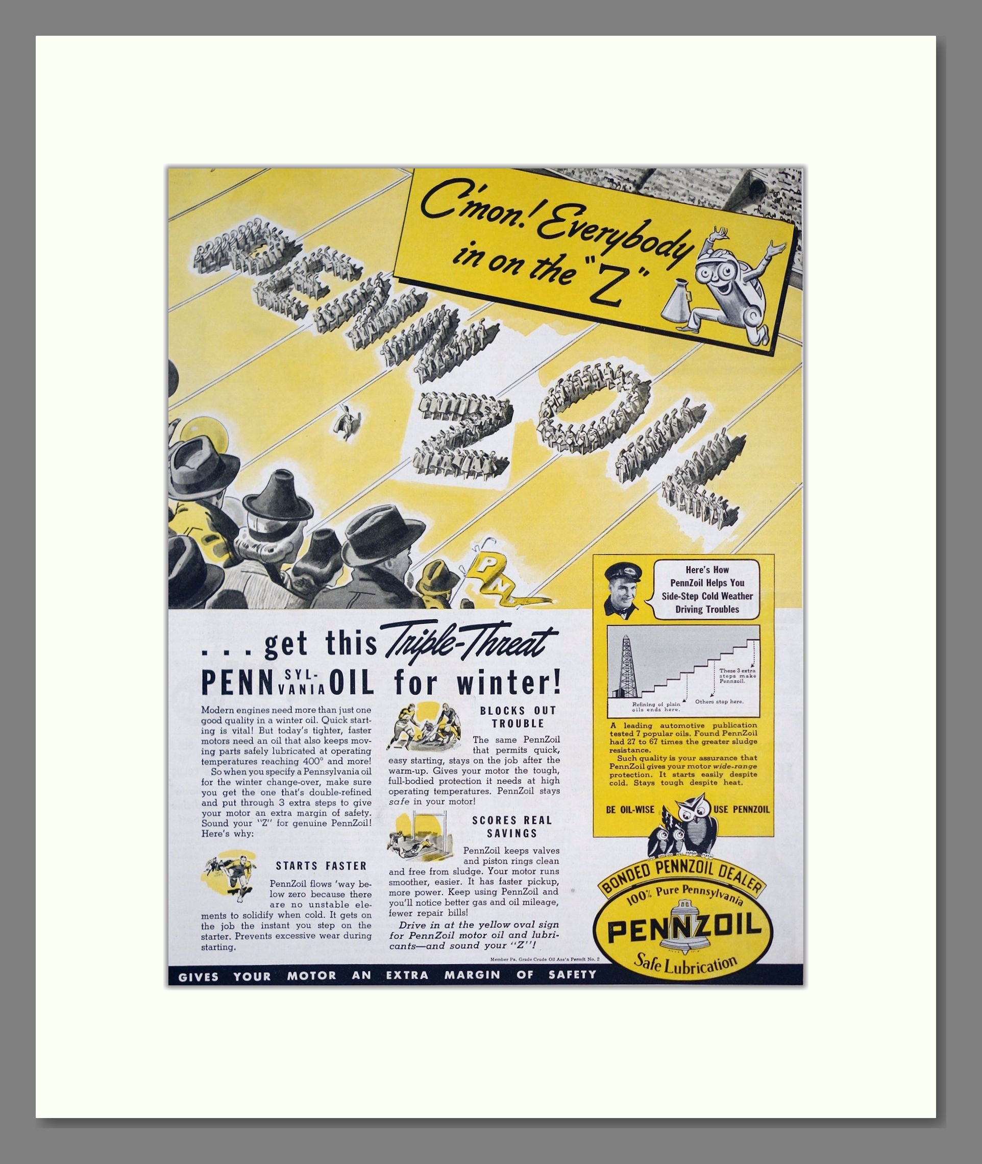 Pennzoil - Motor Oil. Vintage Advert. This is a large classic original advert from 1939. Presented and supplied in a cream bevel cut mount with backing card and clear bag. Ready to fit in a 18 x 14 inches frame. The mounted advert will be posted via courier and well packed - protected with a sheet of hardboard to keep it rigid. Any questions or enquiries, please get in touch, we are here to help! All our adverts, unless clearly stated are originals from the date shown. They make excellent pieces of wall art and stunning gifts. Many are rare and hard to find and once sold, may not be replaced. Remember you are buying a piece of history. Website watermark is not on original.