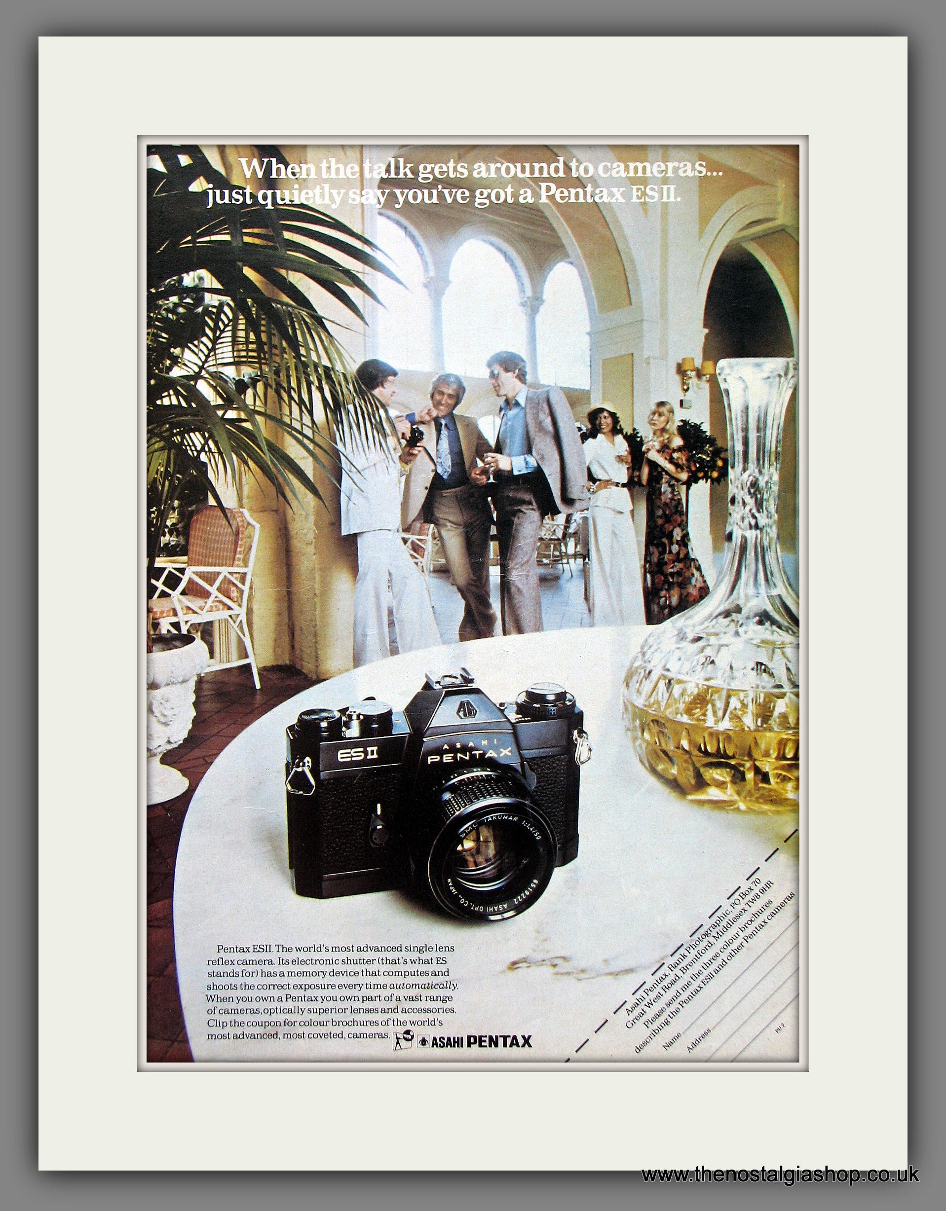 Pentax Asahi ES2 Camera. Vintage Advert. Classic Original advert 1974. Presented and Supplied in a cream bevel cut mount with backing card and clear bag. Ready to fit in 14 x 11 inch frame. Want it framing? If so, buy this then go to Frames Available Category. Click to buy on the suitable frame and we will do the rest. All our adverts, unless clearly stated are Originals from the date shown. They make excellent pieces of wall art and stunning gifts. Many are rare and hard to find and once sold, may not be replaced. Remember you are buying a piece of history. Website watermark is not on original.