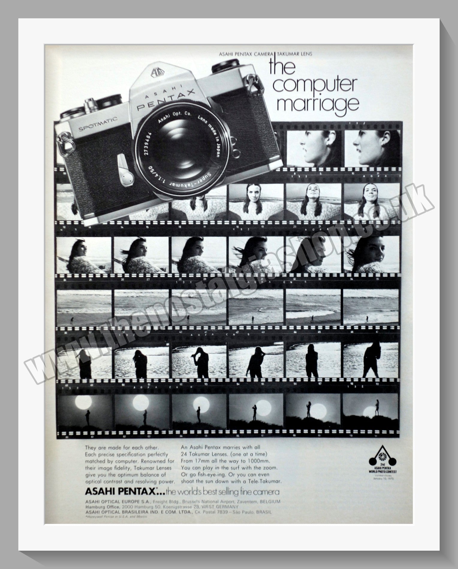 Asahi Pentax Spotmatic SLR 35mm Camera. Vintage Advert. Classic Original Advert 1969. Presented and Supplied in a cream bevel cut mount with backing card and clear bag. Ready to fit in 18 x 14 inch frame. Will be well packed with a sheet of hardboard to keep the mounted Advert flat. All our adverts, unless clearly stated are Originals from the date shown. They make excellent pieces of wall art and stunning gifts. Many are rare and hard to find and once sold, may not be replaced. Remember you are buying a piece of history. Website watermark is not on original. Vintage Cameras, Old Cameras.