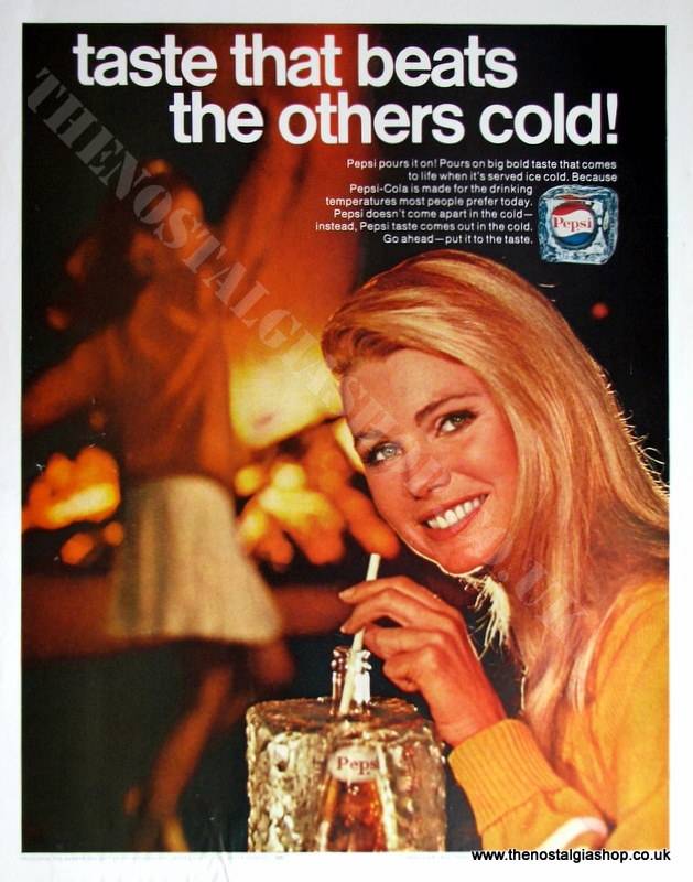 Pepsi. Taste that beast the others cold! Classic original advert 1968. This is a large advert - 14 x 10.5 inches approx and is sold unmounted Want it framing? If so, buy this then go to Frames Available Catagory. Click to buy on the suitable frame (A3 or larger) and we will mount, frame and post it. All our adverts, unless clearly stated are Originals from the date shown They make excellent pieces of wall art and stunning gifts. Many are rare and hard to find and once sold, may not be replaced. Remember you are buying a piece of history. Website watermarks are not on original.