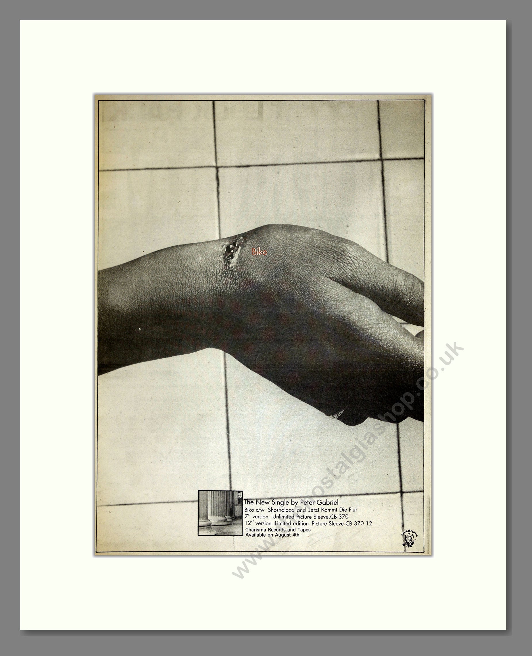 Peter Gabriel - Biko. Vintage Advert. This is a large classic original advert from 1980. Presented and supplied in a cream bevel cut mount with backing card and clear bag. Ready to fit in a 20x16 inch frame. The mounted advert will be posted via courier and well packed - protected with a sheet of hardboard to keep it rigid. Any questions or enquiries, please get in touch, we are here to help! All our adverts, unless clearly stated are originals from the date shown. They make excellent pieces of wall art and stunning gifts. Many are rare and hard to find and once sold, may not be replaced. Remember you are buying a piece of history. Website watermark is not on original.