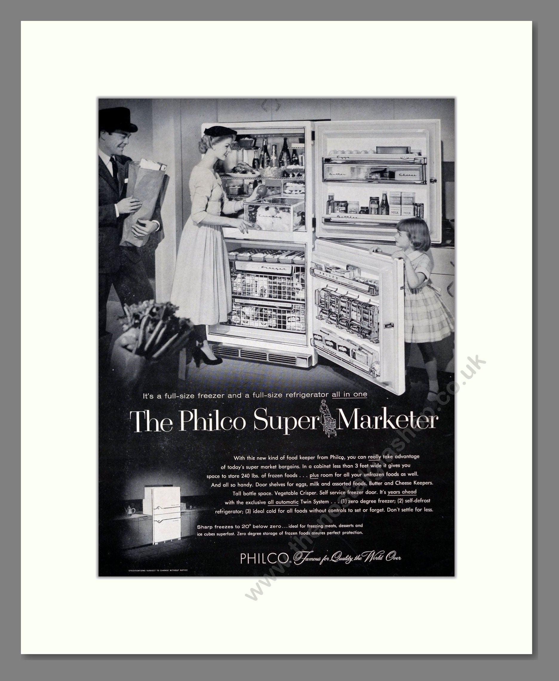 Philco - Refrigerator. Vintage Advert. This is a large classic original advert from 1956. Presented and supplied in a cream bevel cut mount with backing card and clear bag. Ready to fit in a 18 x 14 inches frame. The mounted advert will be posted via courier and well packed - protected with a sheet of hardboard to keep it rigid. Any questions or enquiries, please get in touch, we are here to help! All our adverts, unless clearly stated are originals from the date shown. They make excellent pieces of wall art and stunning gifts. Many are rare and hard to find and once sold, may not be replaced. Remember you are buying a piece of history. Website watermark is not on original.