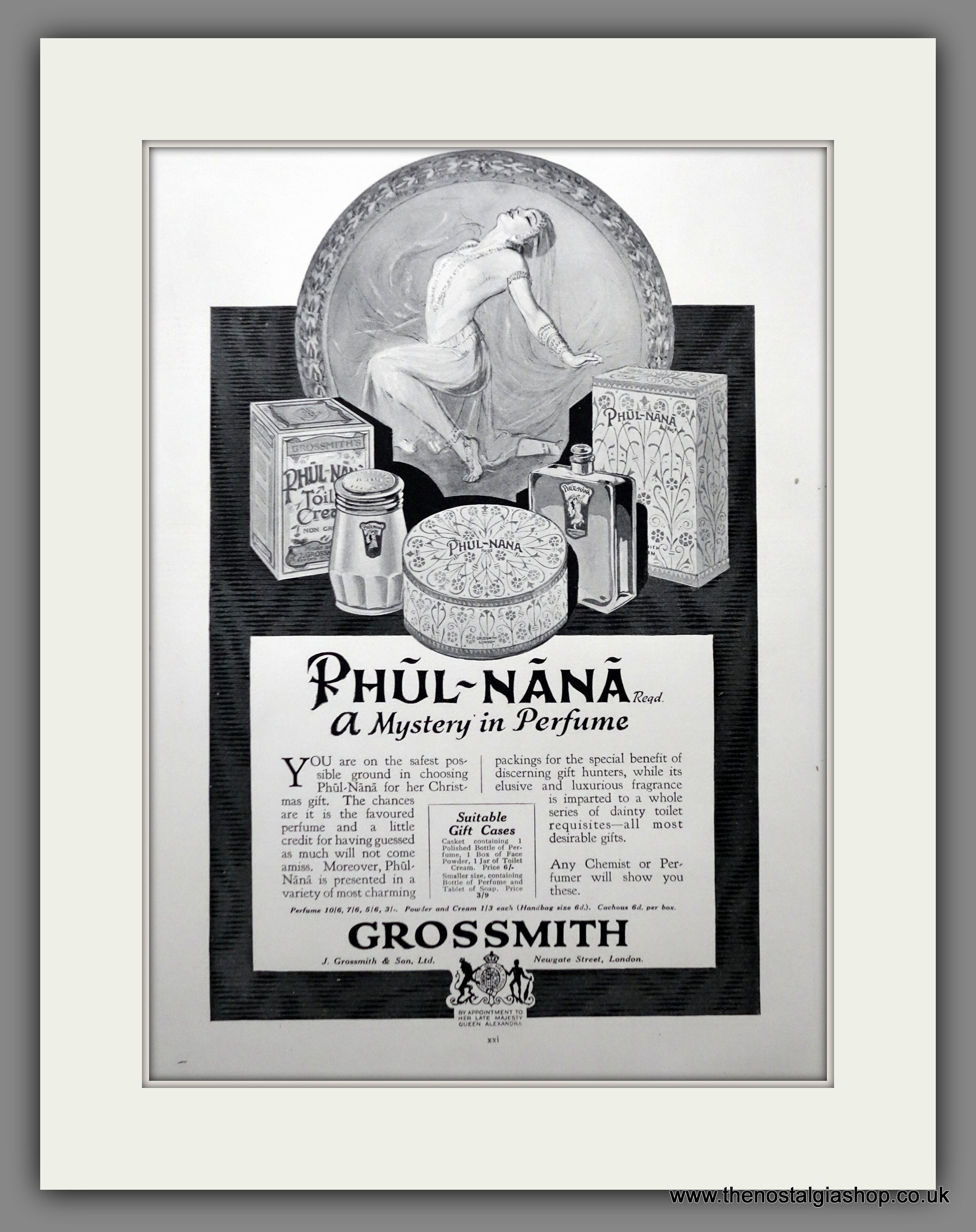 Phul-Nana by Grossmith. Ladies Perfume. Original Vintage Advert 1927. Presented and Supplied in cream bevel cut mount with backing card and clear bag. Ready to fit in 18 x 14 inch frame. All our adverts, unless clearly stated are Originals from the date shown They make excellent pieces of wall art and stunning gifts. Many are rare and hard to find and once sold, may not be replaced. Remember you are buying a piece of history. Website watermark is not on original.