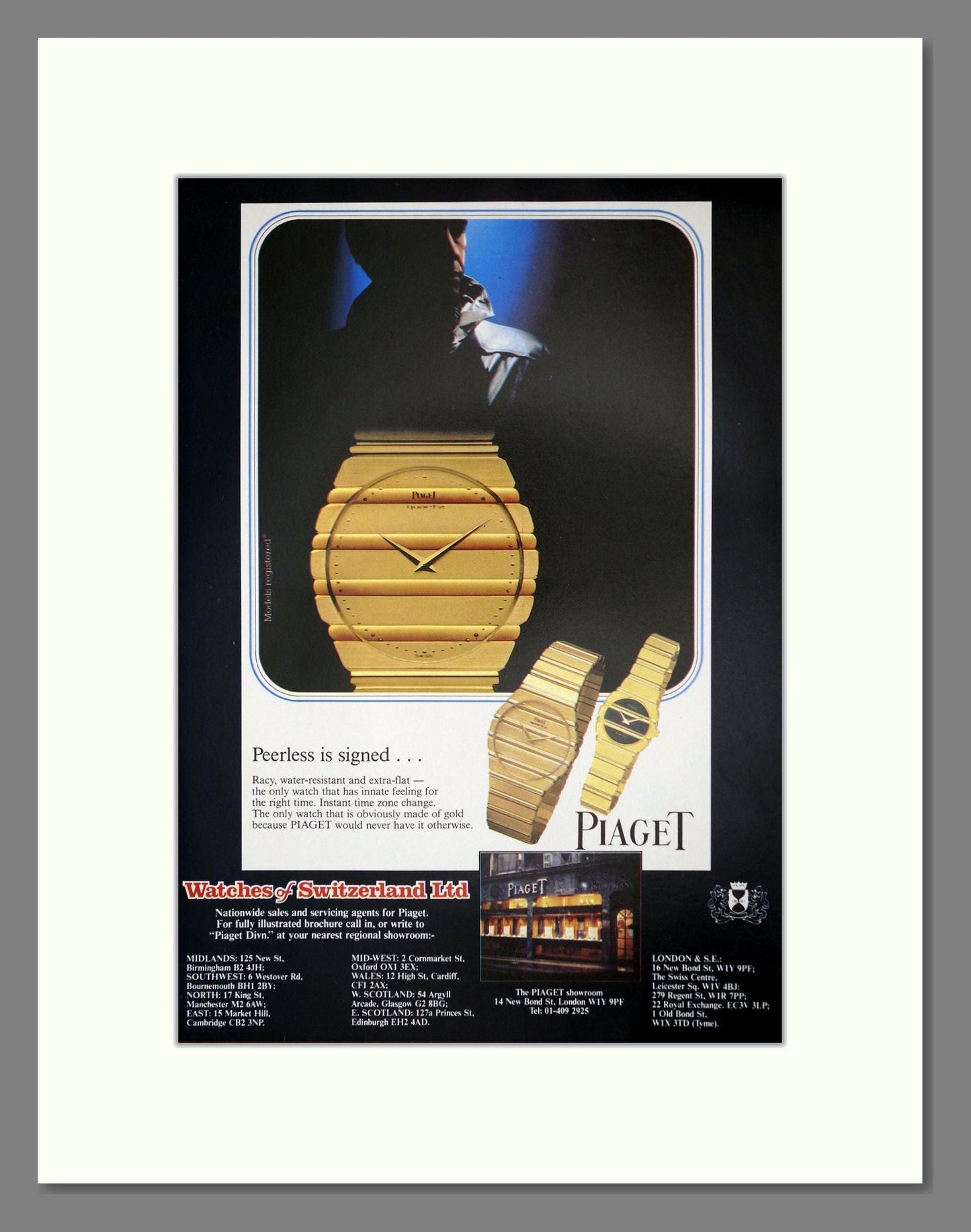 Piaget - Gold Watches. Vintage Advert. This is a classic original advert from 1984. Presented and supplied in a cream bevel cut mount with backing card and clear bag. Ready to fit in a 14 x 11 inches frame. The mounted advert will be posted via courier and well packed - protected with a sheet of hardboard to keep it rigid. Any questions or enquiries, please get in touch, we are here to help! All our adverts, unless clearly stated are originals from the date shown. They make excellent pieces of wall art and stunning gifts. Many are rare and hard to find and once sold, may not be replaced. Remember you are buying a piece of history. Website watermark is not on original.
