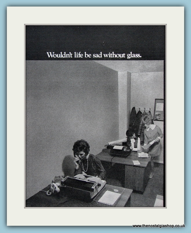 Pilkington Glass. Wouldn't life be sad without glass. Classic original adverts 1969. Price is for 2 advertsPresented in cream bevel cut mount with backing card and clear bag. Each is ready to fit in 14 x 11 inch frames. Want them framing? If so, buy this then go to Frames Available Catagory. Click to buy on the suitable frame(s) and we will do the rest. All our adverts, unless clearly stated are Originals from the date shown They make excellent pieces of wall art and stunning gifts. Many are rare and hard to find and once sold, may not be replaced. Remember you are buying a piece of history. Website watermark is not on original.