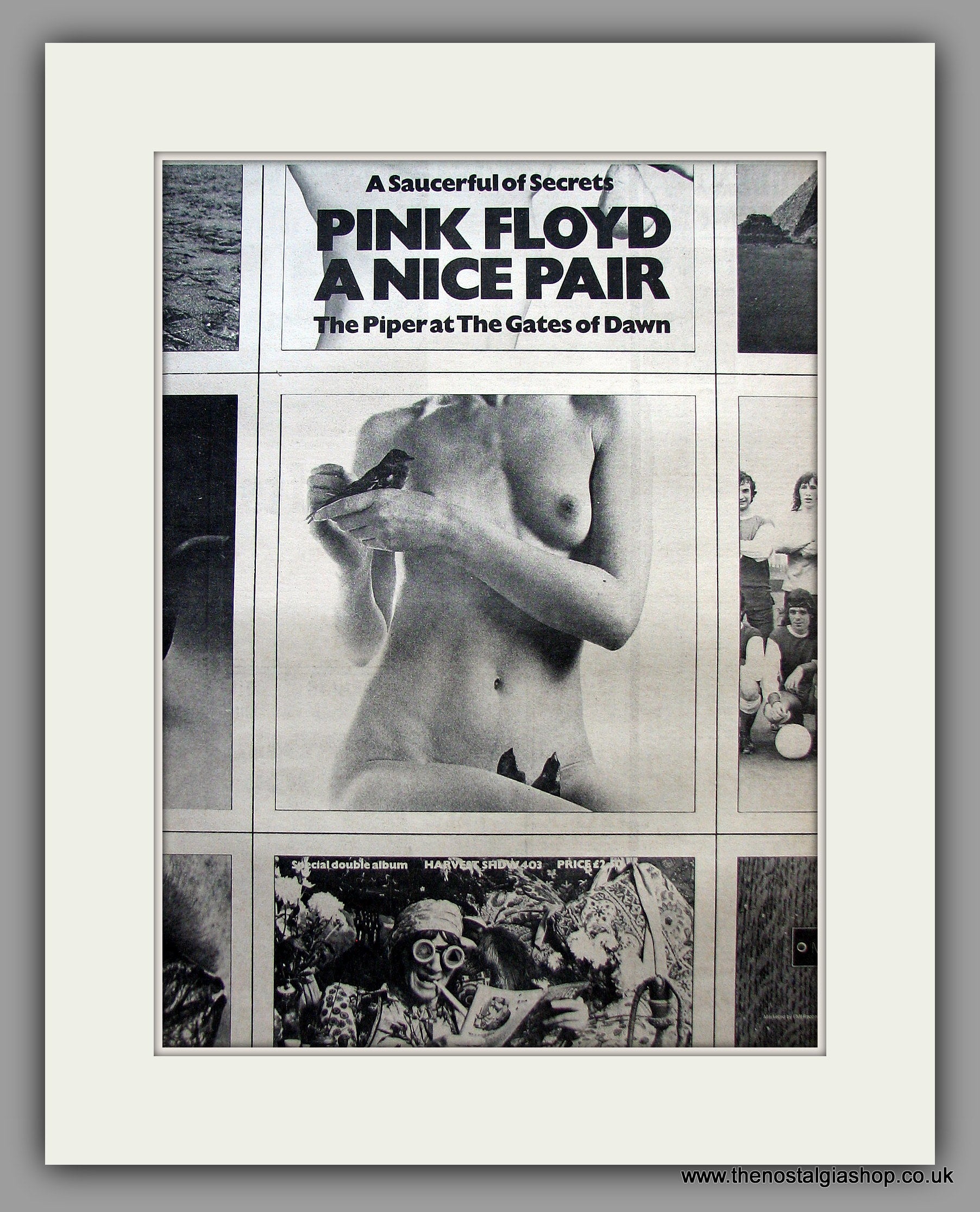 Pink Floyd. A Saucerful of Secrets and The Piper at the Gates of Dawn. David Gilmour. This is a large classic Original advert 1973. Presented in cream bevel cut mount with backing card and clear bag. Ready to fit in 20 x 16 inch frame. The mounted advert will be posted via courier and well packed - protected with a sheet of hardboard to keep it rigid. Any questions or inquiries, please get in touch, we are here to help! All our adverts, unless clearly stated are Originals from the date shown. They make excellent pieces of wall art and stunning gifts. Many are rare and hard to find and once sold, may not be replaced. Remember you are buying a piece of history. Website watermark is not on original.