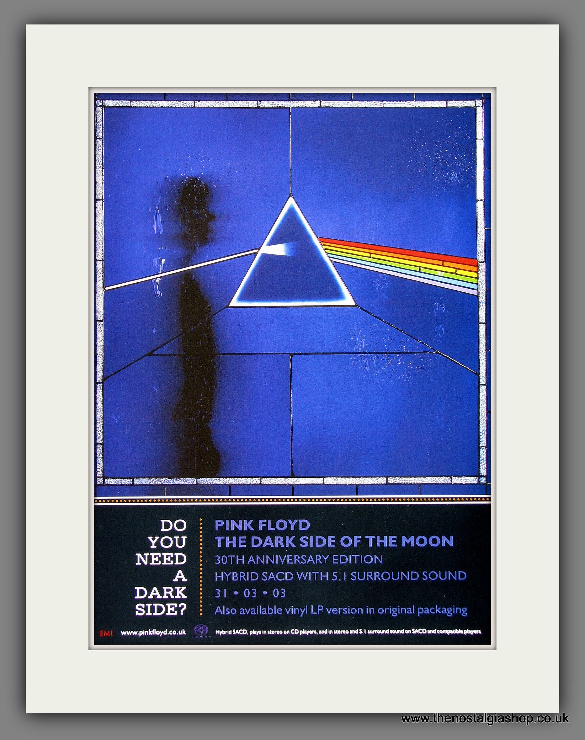 Pink Floyd. Dark Side Of The Moon, 30th Anniversary edition. Classic Original advert 2003. It is presented and Supplied in a cream bevel cut mount with backing card and Display bag. Ready to fit in 14 x 11 inch frame. Want it framing? If so, buy these then go to Frames Available Category. Click to buy on the suitable frame and we will do the rest. All our adverts, unless clearly stated are Originals from the date shown. They make excellent pieces of wall art and stunning gifts. Many are rare and hard to find and once sold, may not be replaced. Remember you are buying a piece of history. Website watermark is not on original. David Gilmour, Roger Waters, Nick Mason, Richard Wright, Syd Barrett.