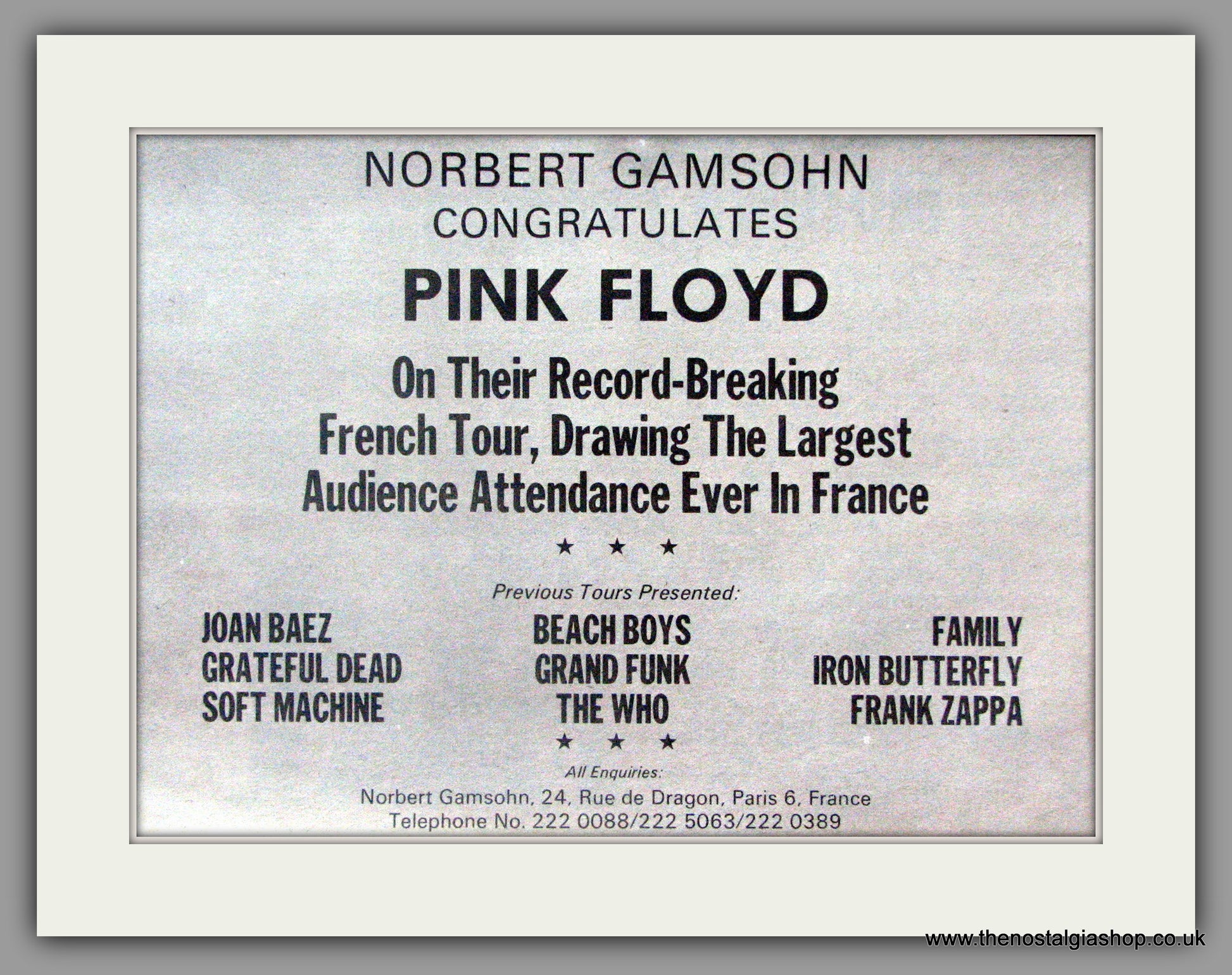Norbert Gamsohn Congratulates Pink Floyd on their record breaking French Tour 1973. Classic original advert 1973. David Gilmour. Presented in cream bevel cut mount with backing card and clear bag. Ready to fit in 12 x 10 inch frame. Want it framing? If so, buy this then go to Frames Available Category. Click to buy on the suitable frame and we will do the rest. All our adverts, unless clearly stated are Originals from the date shown. They make excellent pieces of wall art and stunning gifts. Many are rare and hard to find and once sold, may not be replaced. Remember you are buying a piece of history. Website watermark is not on original.