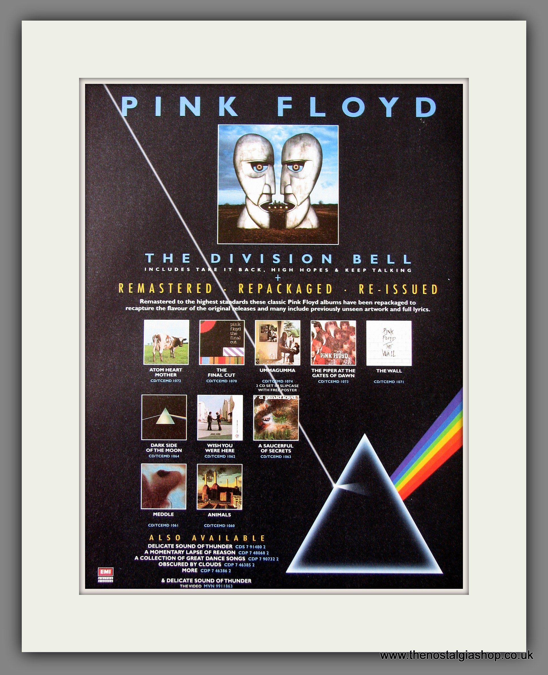 Pink Floyd. The Division Bell, Remastered. Classic Original advert 1994. It is presented and Supplied in a cream bevel cut mount with backing card and Display bag. Ready to fit in 14 x 11 inch frame. Want it framing? If so, buy these then go to Frames Available Category. Click to buy on the suitable frame and we will do the rest. All our adverts, unless clearly stated are Originals from the date shown. They make excellent pieces of wall art and stunning gifts. Many are rare and hard to find and once sold, may not be replaced. Remember you are buying a piece of history. Website watermark is not on original.