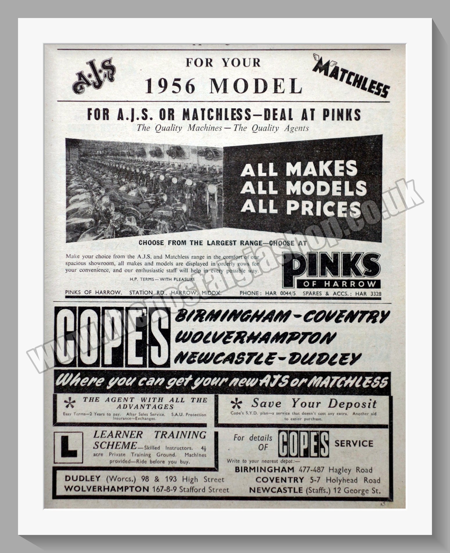 Pinks Of Harrow Motorcycle Dealerships. Original Advert 1955 (ref AD57286)