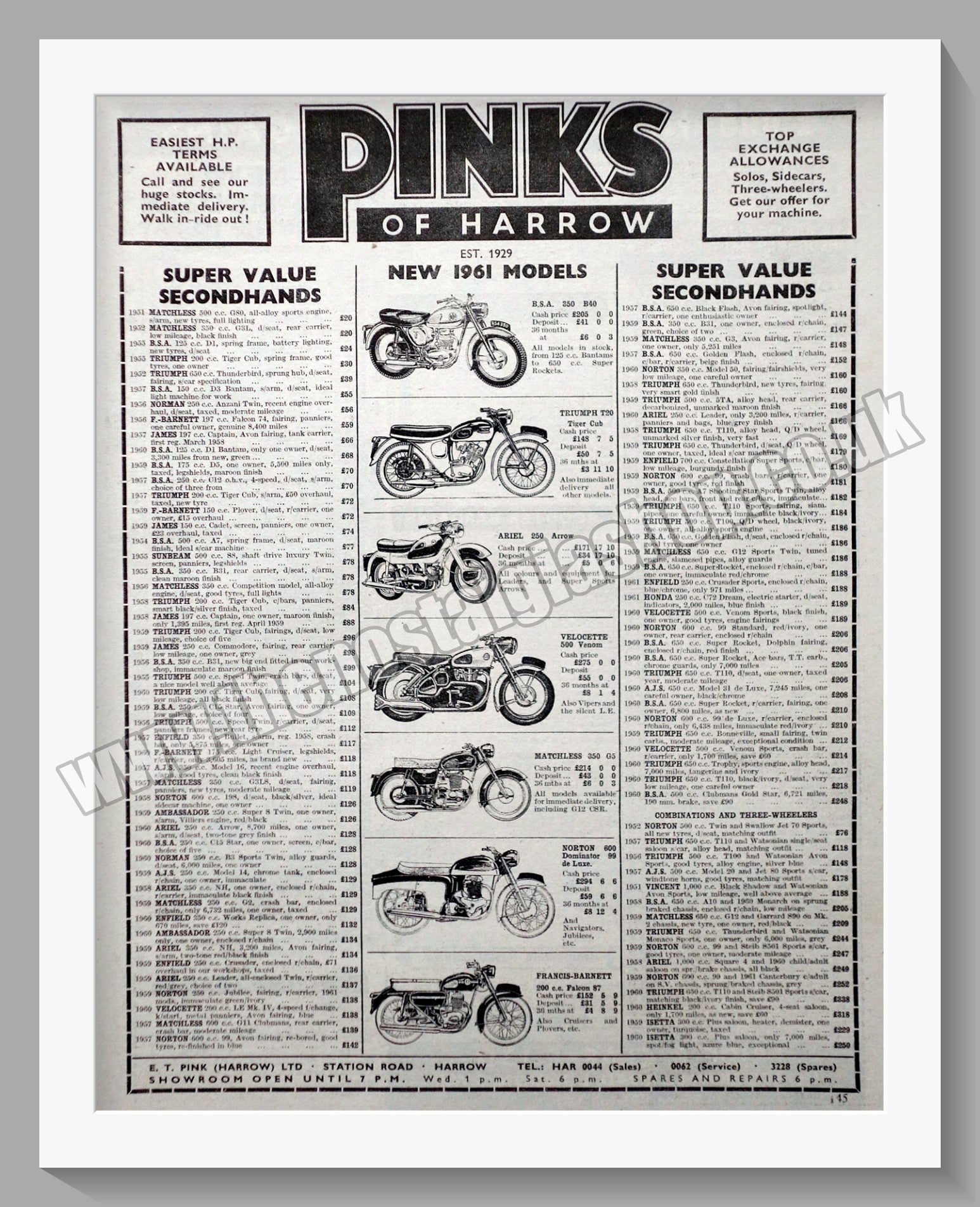 Pinks Of Harrow Motorcycle Dealerships. Original Advert 1961 (ref AD57305)