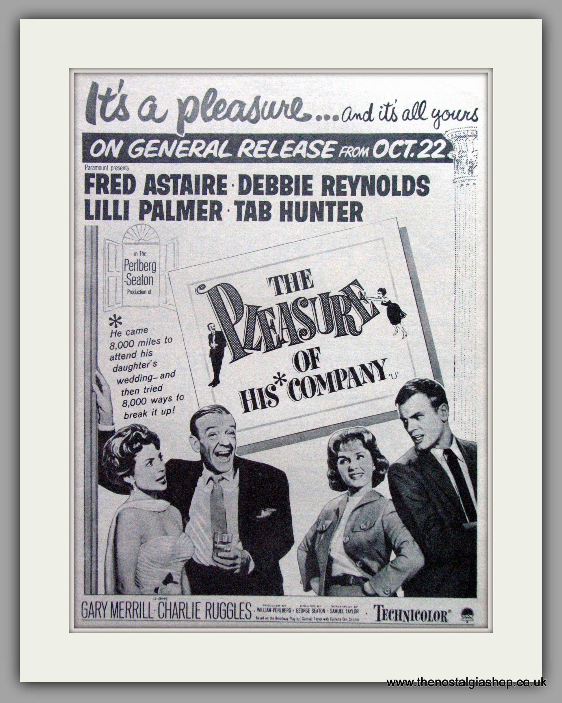 The Pleasure Of His Company-Debbie Reynolds, Fred Astaire. Classic Original advert 1961. Presented in cream bevel cut mount with backing card and clear bag. Ready to fit in 14 x 11 inch frame. Want it framing? If so, buy this then go to Frames Available Category. Click to buy on the suitable frame and we will do the rest. All our adverts, unless clearly stated are Originals from the date shown. They make excellent pieces of wall art and stunning gifts. Many are rare and hard to find and once sold, may not be replaced. Remember you are buying a piece of history. Website watermark is not on original. Slash, Axle Rose.
