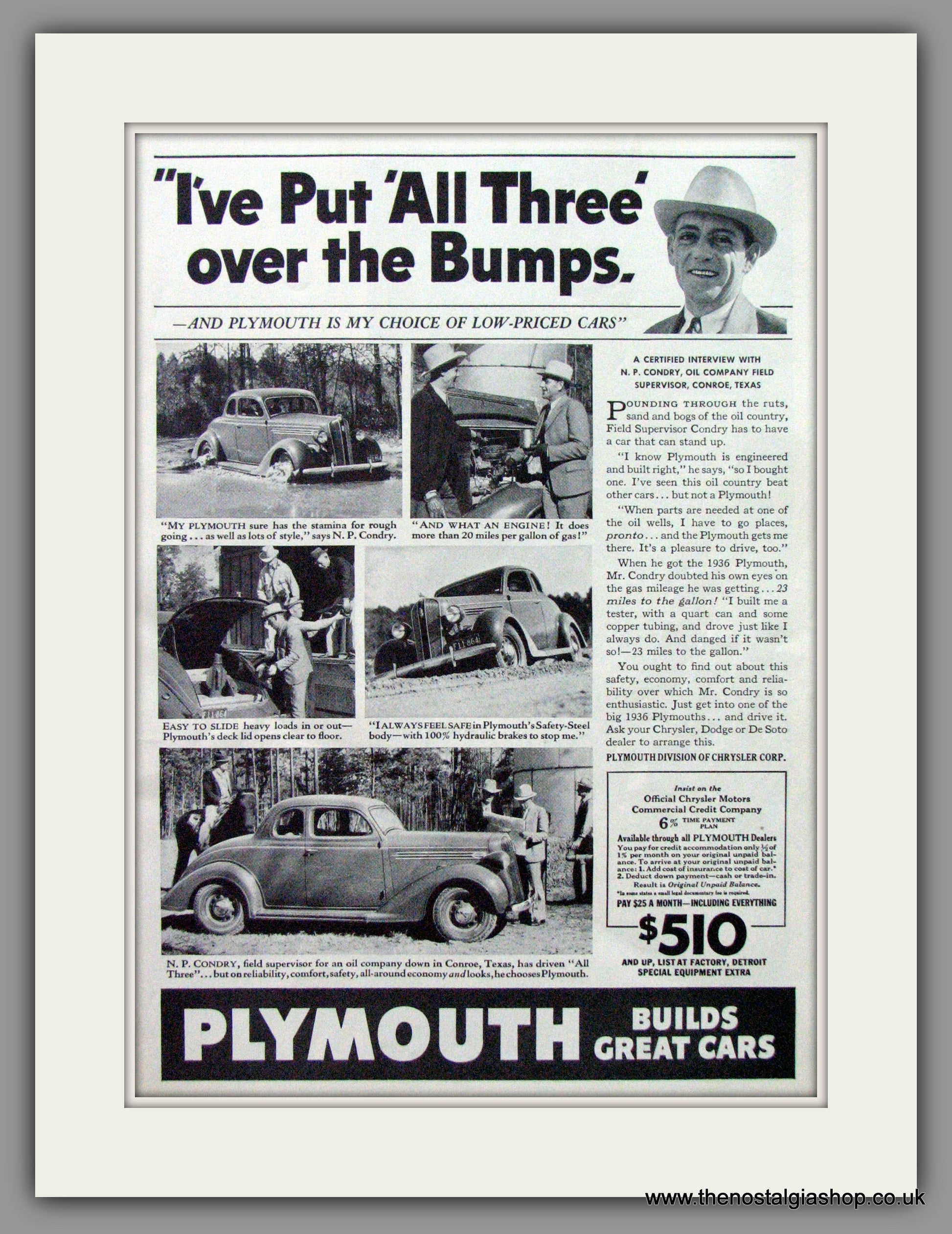 Plymouth 2 Door. Vintage Advert. Classic Original American advert 1936. Presented and Supplied in cream bevel cut mount, size 14 x 11 inches with backing card and clear bag. Ready to frame. Want it framing? If so, buy this then go to Frames Available Category. Click to buy on the suitable frame and we will do the rest. All our adverts, unless clearly stated are Originals from the date shown They make excellent pieces of wall art and stunning gifts. Many are rare and hard to find and once sold, may not be replaced. Remember you are buying a piece of history. Website watermark is not on original.