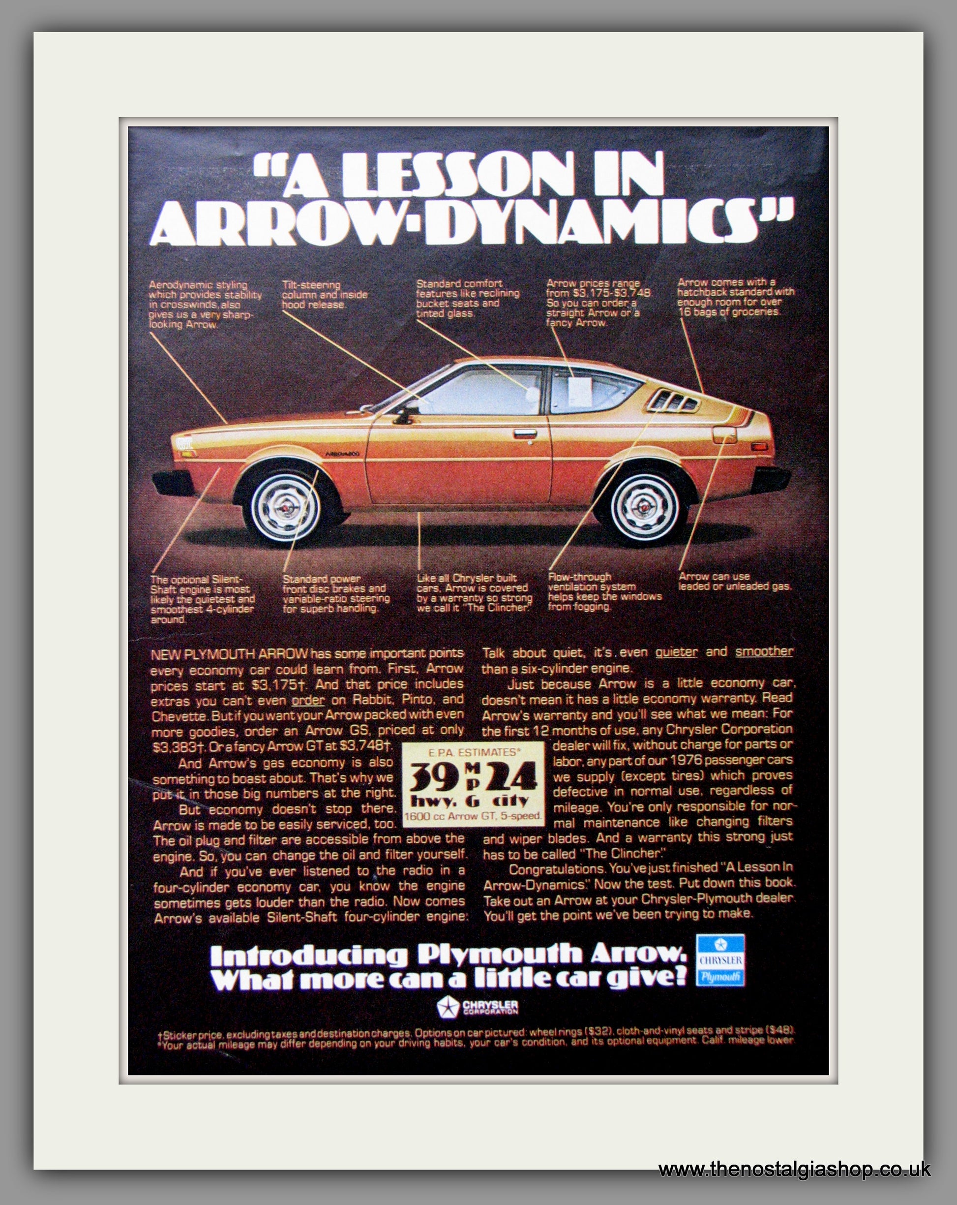 Plymouth Arrow '76. Vintage Advert. Classic Original American advert 1976. Presented and Supplied in cream bevel cut mount, size 14 x 11 inches with backing card and clear bag. Ready to frame. Want it framing? If so, buy this then go to Frames Available Category. Click to buy on the suitable frame and we will do the rest. All our adverts, unless clearly stated are Originals from the date shown They make excellent pieces of wall art and stunning gifts. Many are rare and hard to find and once sold, may not be replaced. Remember you are buying a piece of history. Website watermark is not on original.