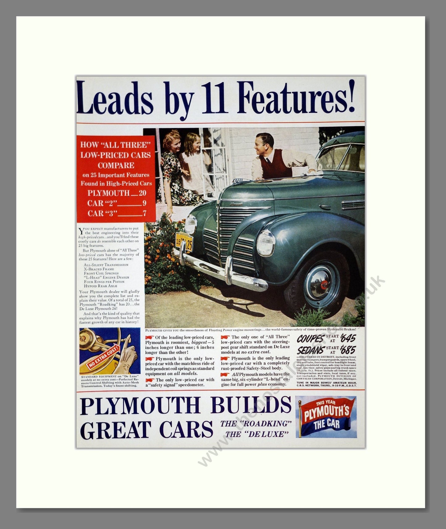 Plymouth - Leads By 11 Features. Vintage Advert. This is a large classic original advert from 1939. Presented and supplied in a cream bevel cut mount with backing card and clear bag. Ready to fit in a 18 x 14 inches frame. The mounted advert will be posted via courier and well packed - protected with a sheet of hardboard to keep it rigid. Any questions or enquiries, please get in touch, we are here to help! All our adverts, unless clearly stated are originals from the date shown. They make excellent pieces of wall art and stunning gifts. Many are rare and hard to find and once sold, may not be replaced. Remember you are buying a piece of history. Website watermark is not on original.