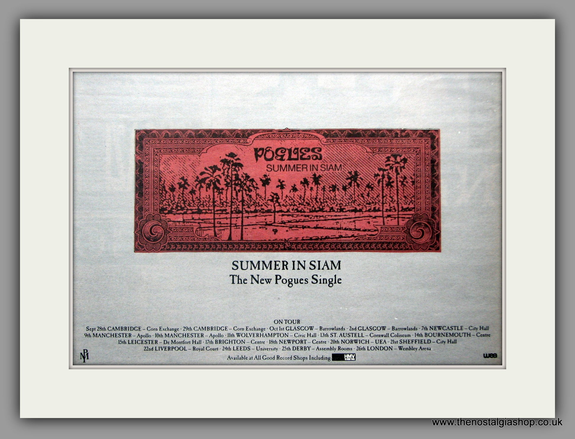 The Pogues. Summer In Siam. Classic Original advert 1990. Presented in cream bevel cut mount with backing card and clear bag. Ready to fit in 14 x 11 inch frame. Want it framing? If so, buy this then go to Frames Available Category. Click to buy on the suitable frame and we will do the rest. All our adverts, unless clearly stated are Originals from the date shown. They make excellent pieces of wall art and stunning gifts. Many are rare and hard to find and once sold, may not be replaced. Remember you are buying a piece of history. Website watermark is not on original. Rock Music.