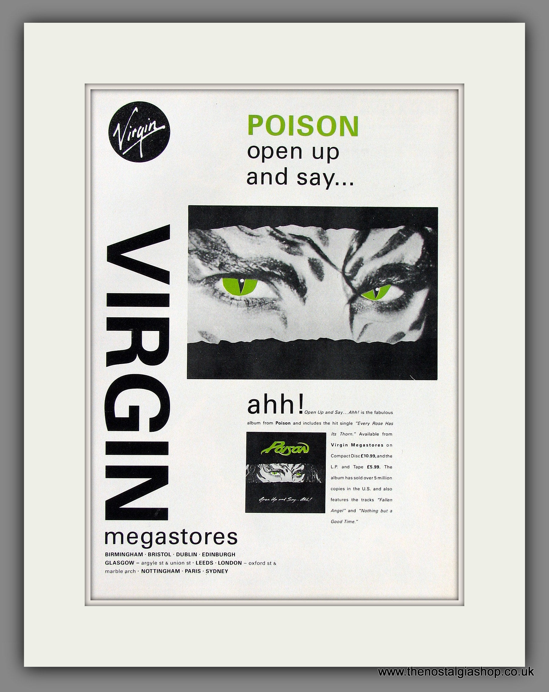 Poison. Open Up And Say Ahh. Classic original advert 1989. Presented and Supplied in a cream bevel cut mount with backing card and Clear bag. Ready to fit in 14 x 11 inch frame. Want it framing? buy this then go to Frames Available Category. Click to buy on the suitable frame and we will do the rest. All our adverts, unless clearly stated are Originals from the date shown They make excellent pieces of wall art and stunning gifts. Many are rare and hard to find and once sold, may not be replaced. Remember you are buying a piece of history. Website watermark is not on original.