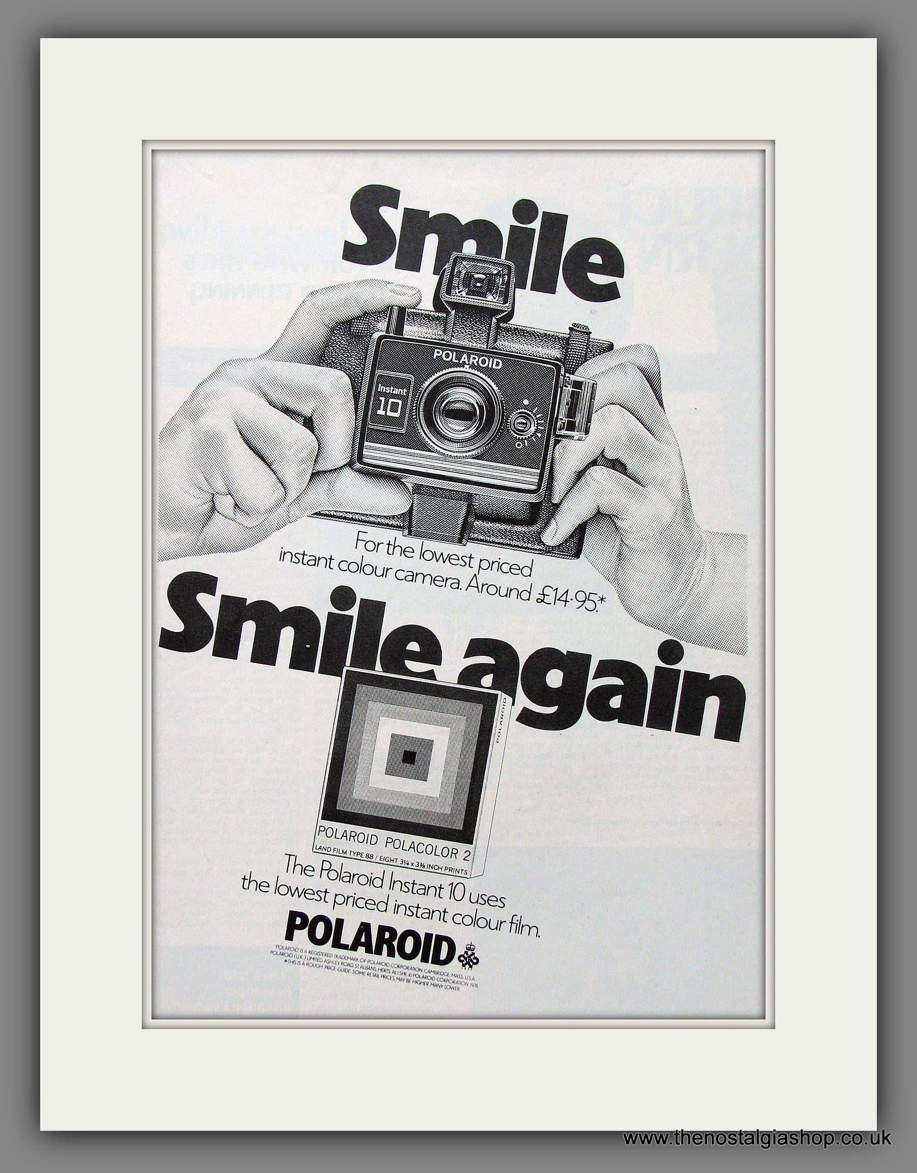 Polaroid Instant 10 Camera. Vintage Advert. Classic Original American advert 1978. Presented and Supplied in a cream bevel cut mount with backing card and clear bag. Ready to fit in 14 x 11 inch frame. Want it framing? If so, buy this then go to Frames Available Category. Click to buy on the suitable frame and we will do the rest. All our adverts, unless clearly stated are Originals from the date shown. They make excellent pieces of wall art and stunning gifts. Many are rare and hard to find and once sold, may not be replaced. Remember you are buying a piece of history. Website watermark is not on original.